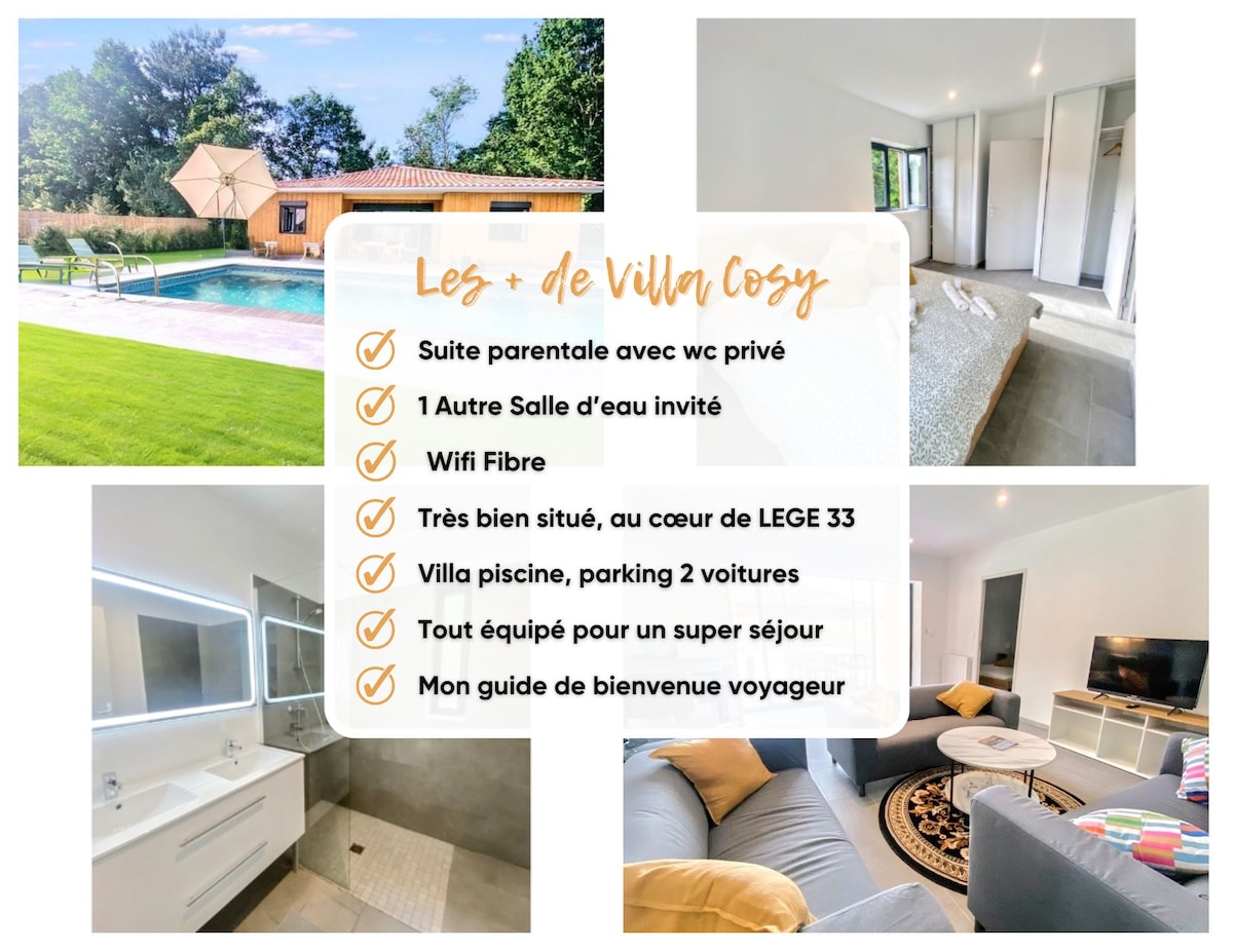 非常漂亮的新建別墅,採用「真正」木材建造,面積 150 平方公尺。提供: - 3 間臥室,其中 2 間有閣樓(地板床墊) - 2 間浴室、2 間廁所。 - 周圍有 3 個陰涼的露台 - 3公尺X2公尺的小型泳池,變涼 - 客廳圖書室、遊戲 -戶外露臺和樓上有遮蔭的露臺,配有戶外休息室 - 花園內有停車位 - 家電設備一應俱全。 它位於萊日堡 (Lège bourg) 的中心,距離海灘和北部盆地 (Nord bassin) 只有幾公里。