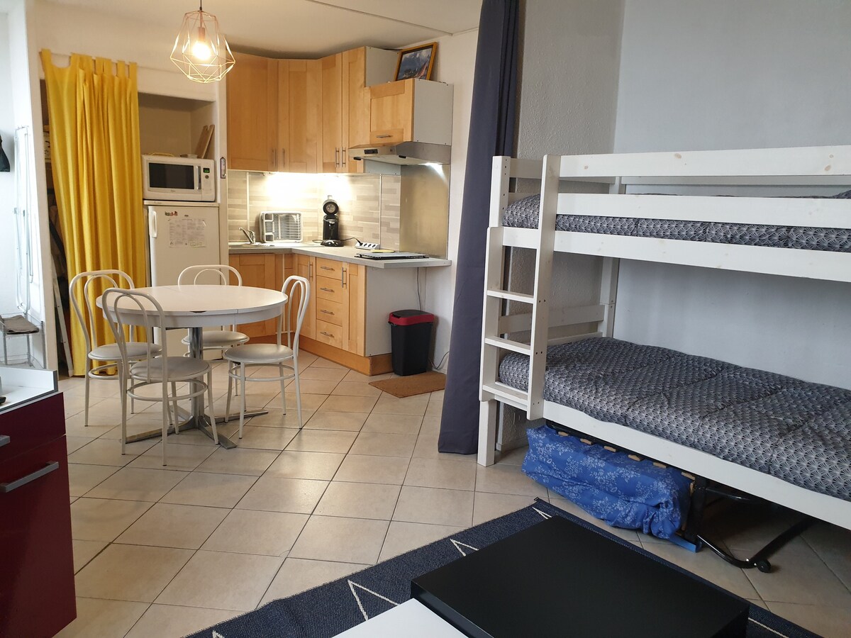 工作室,可供2至4人舒適入住,住宅位於度假村的中心,靠近滑雪坡和商店,提供免費私人停車位(通過密碼進入), 我們剛剛翻新了它,保留了友好、溫暖但實用的精神,可以看到pic d 'anie、小屋村和部分斜坡,最終會吸引您 價格包括清潔費,為所有人提供潔淨保證,讓所有人都安心