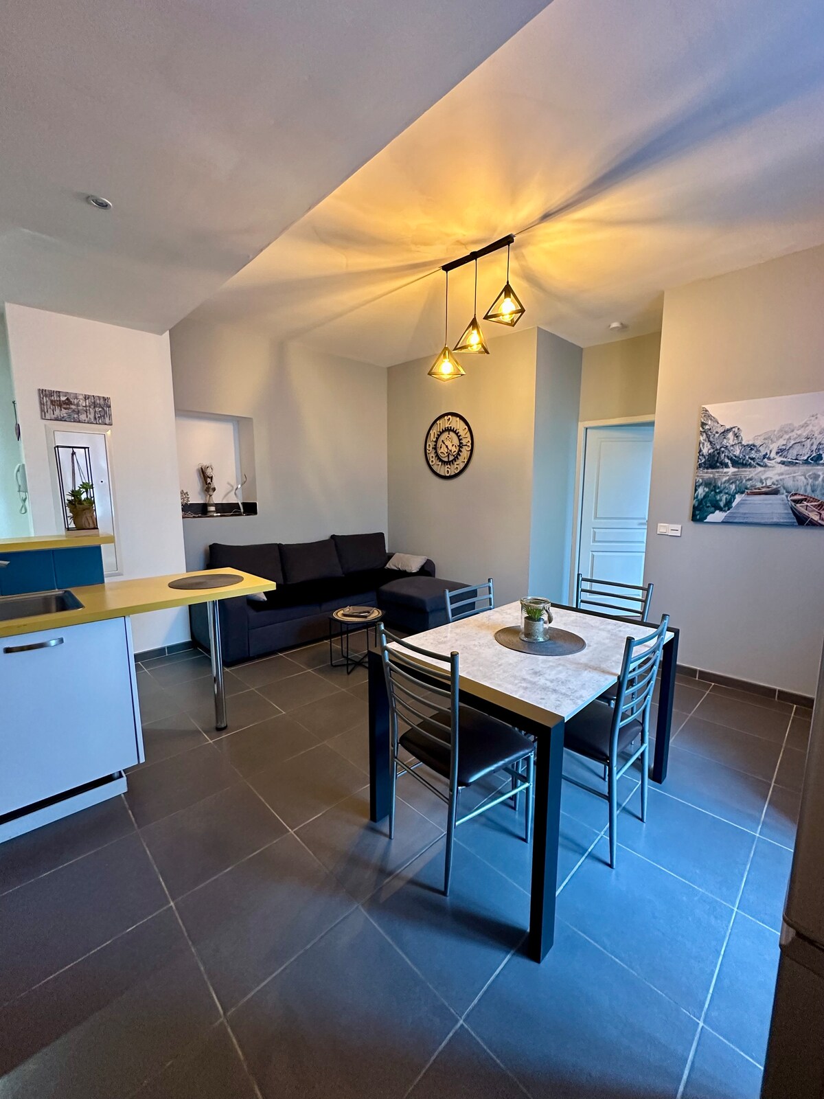 大型單間公寓(37平方公尺),距離市政廳和旅遊局150公尺,步行8分鐘即可抵達溫泉。1樓,安靜,山景。全新翻修並配備全新家具。可容納 2 至 4 位旅客。設備一應俱全。3 星級、4 鑽級……附近有 3 個免費停車場。私人滑雪房、內院有共用自行車棚。3 週療養住宿有特定價格,請與我聯絡,以獲得個人化的報價。