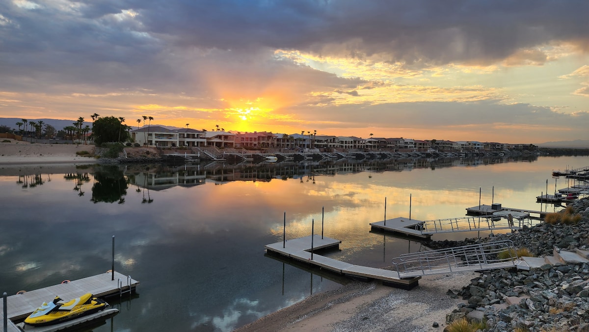 海濱房源,可使用私人海灘和碼頭。提供短期或長期住宿所需的所有升級。美麗的3間臥室/2間浴室加上書房,配有2臺冰箱、前置洗衣機/烘乾機、花崗岩檯面、室外燃氣烤肉。距離客人/船舶停車場和公共高爾夫球場僅幾步之遙。靠近針頭碼頭和傑克·史密斯船舶下水。開車即可抵達拉夫林、海盜灣、哈瓦蘇和阿維。 預訂需要填寫HOA表格。請向房東發送訊息,了解長期住宿和雪鳥折扣價。