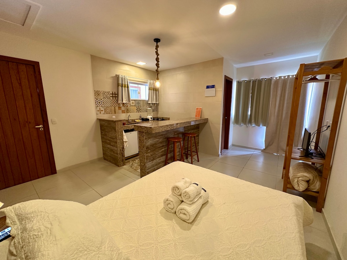 Um estúdio super confortável , a 100 metros da praia baia formosa. É formado por quarto ,cozinha americada,banheiro e varanda. Ar condicionado e ventilador de teto. Bairro muito seguro com estacionamento privado. Disponibilizamos roupas de cama e toalhas .