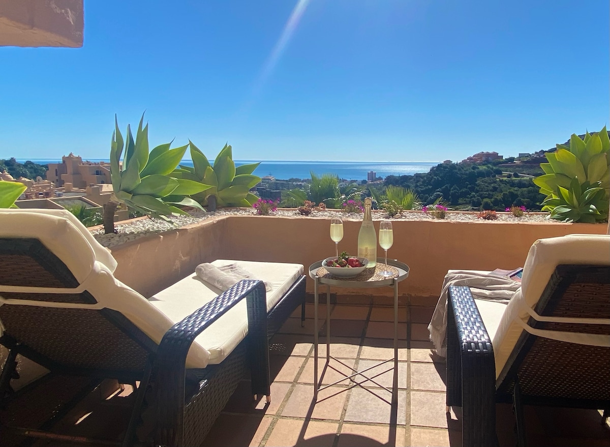 這間現代奢華的頂層公寓設有2間寬敞的臥室和2間大浴室、設備齊全的開放式廚房和用餐區。 超大客廳可欣賞海景和山景。 位於著名的Duquesa區,距離大海、遊艇碼頭和高爾夫球場車程不到3分鐘。 整個太陽海岸都在附近:埃斯特波納、馬貝拉和索托格蘭德非常近(10至30分鐘)!