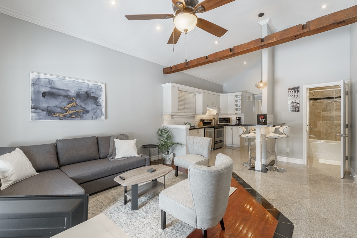 畫廊套房(Gallery Suite)位於洛克街(Locke St.)和麥克馬斯特(McMaster)附近,非常適合商務或休閒住宿。這間明亮的開放式套房配有獨立臥室,擁有蓋爾夫藝術家Ryan Price的獨特藝術品。位於安靜的RMT診所上方,您將享受寧靜和私人的住宿。步行即可抵達時尚商店和咖啡廳。為方便您使用,包括免費泊車設施。立即預訂,體驗舒適、藝術與便利的融合!