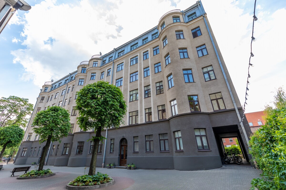 裝潢精美的公寓-位於里加市中心著名的里加新藝術區的絕佳位置。門口有很多咖啡廳和很棒的餐廳。步行即可抵達舊城區、藝術博物館、美麗的公園、雜貨店。位於安靜的後院大樓。 不用擔心您需要何時入住,這是自助入住! 私人上鎖庭院內可★免費停車。 步行7分鐘即可抵達前往機場或中央火車站★的巴士站。