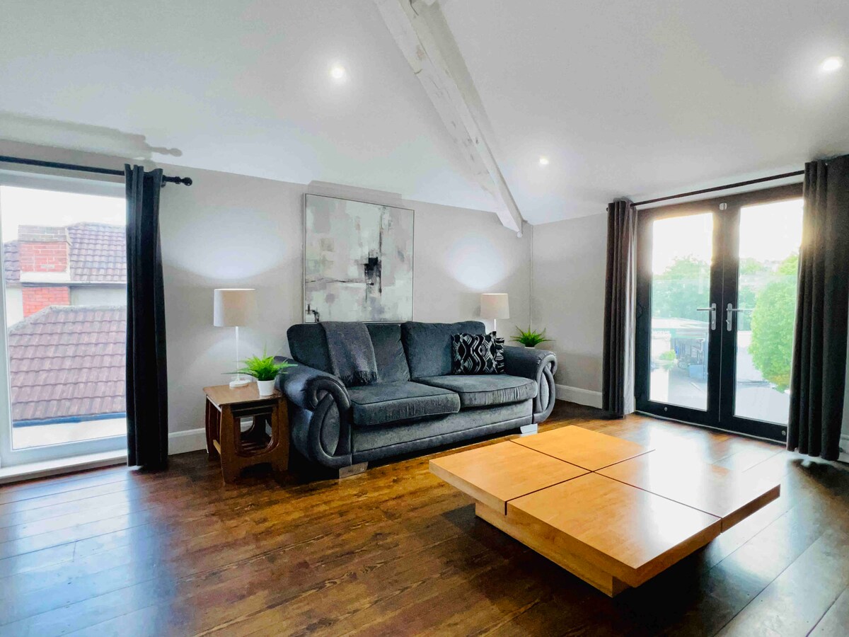 豪華現代化單間公寓:寬敞的單間公寓,可免費停車。 新建的Wi-Fi ,完全加熱和隔熱,供全年使用。 該單間公寓距離Ashton Court Estate僅幾步之遙,距離Clifton Village和Central Bristol僅幾步之遙。 額外的雙人牀可供額外2位房客入住;每晚收取60英鎊的費用,在抵達時收取。 請在預訂時向房東說明。 請注意:此單間公寓是主家庭住宅內的獨立住宅。