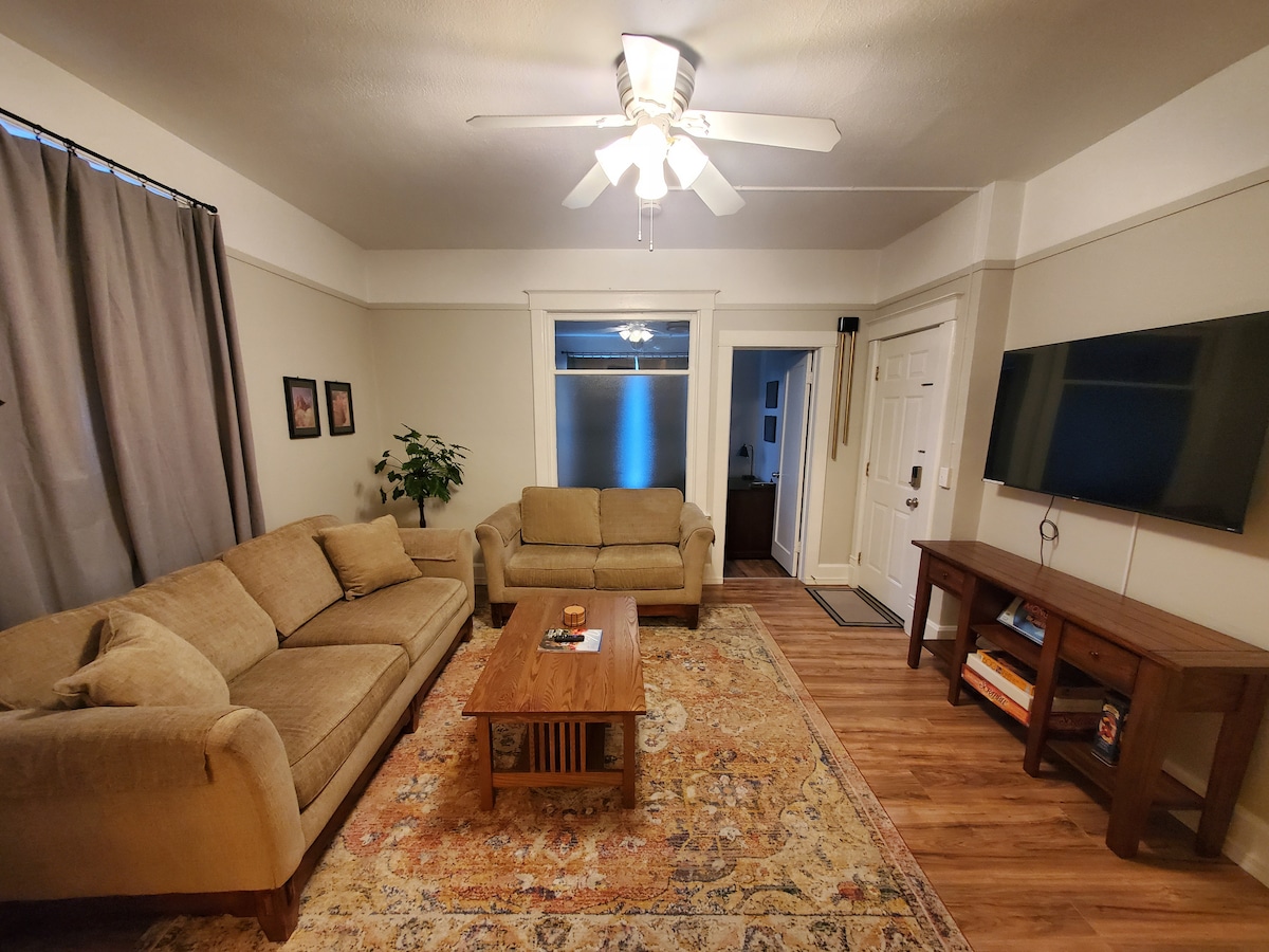 位於市中心的聯排別墅,距離St. Joe醫院,距離Lewis-Clark州立學院一個街區。安靜舒適的2床/1浴室,樓下有加大雙人床臥室,主樓有標準雙人床臥室,私人停車位,有私人入口,房子北側(巷子)。設備齊全的廚房、Wi-Fi、樓下洗衣機/烘乾機、空調和暖氣、密碼鎖入口。除了樓梯下的樓下儲藏室外,您可以使用整個房源。露臺有餐桌和休息區。