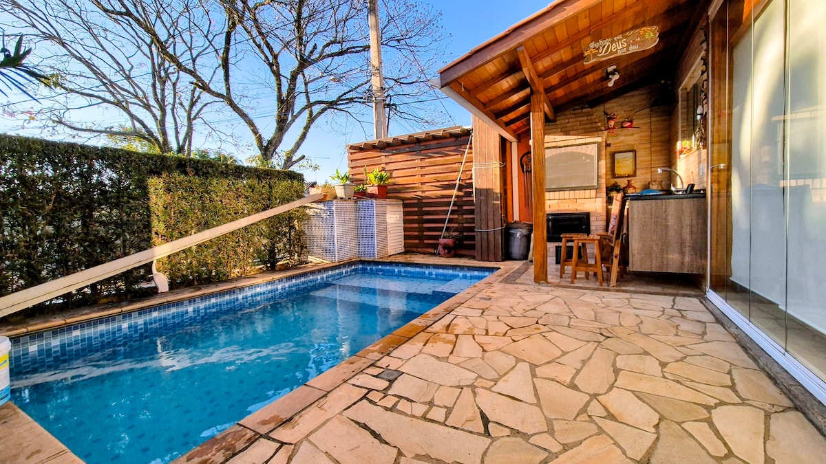 這間房屋為工業風格,非常明亮,沉浸在大西洋森林中,位於莫倫加巴(Morungaba)氣候度假勝地,距離聖保羅100公里,距離坎皮納斯45公里。 它有Wi-Fi、冷暖空調、55吋智能電視、陽台、私人燒烤和火坑。我們不接受寵物。 在牧場上,與任何其他客人共用:柏油跑道、網球場、溫水泳池、乾式桑拿、彈床等等。 如有更多旅人或獨家使用,請發送訊息給我。
