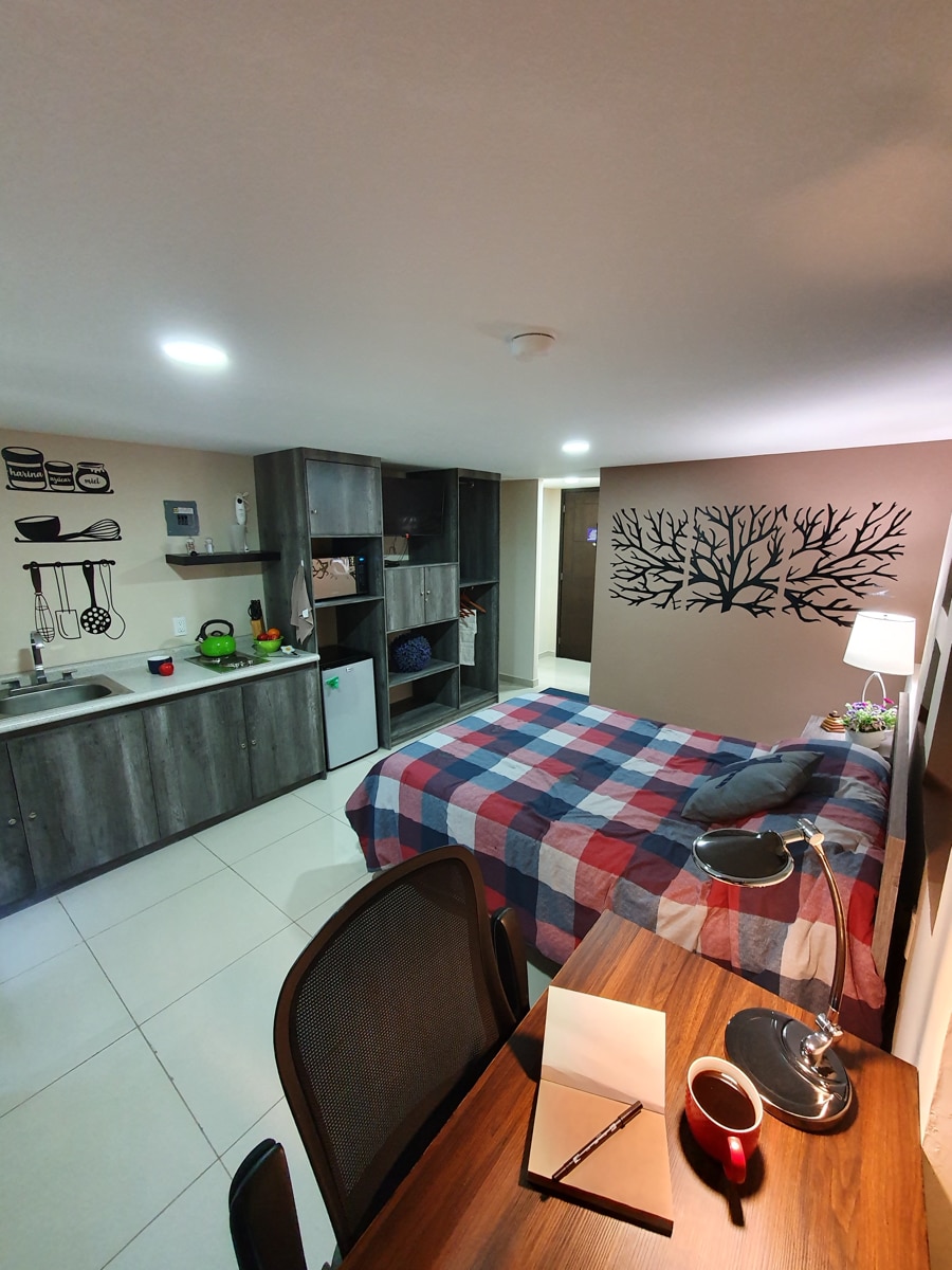 全新套房的優質舒適住宿,擁有令人難以置信的空間、顏色和現代化的裝飾。 功能性套房! ! 您的套房設備齊全,每間套房均配有一張雙人牀、乾淨的牀上用品、設備齊全的小廚房、微波爐、Servibar式冰箱、寬敞的衣櫃和工作區域、寬敞的現代化浴室。