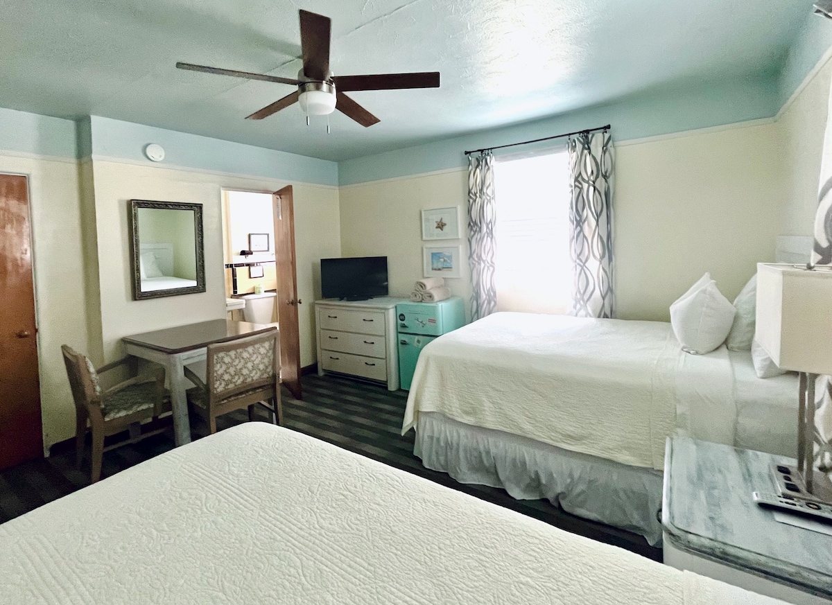 作為我們精心修復的1950年代精品旅館Zenneth Manor的一部分,您的舒適房間明亮、通風。我們的二樓房間距離海灘和木板僅1個街區。 您的房間配有兩張雙人床、獨立浴室、獨立控制的空調、平面電視和迷你冰箱。我們提供免費停車位、免費海灘標籤、WiFi、上午咖啡和茶以及每日清潔服務。 步行即可抵達熱門商店與餐廳。