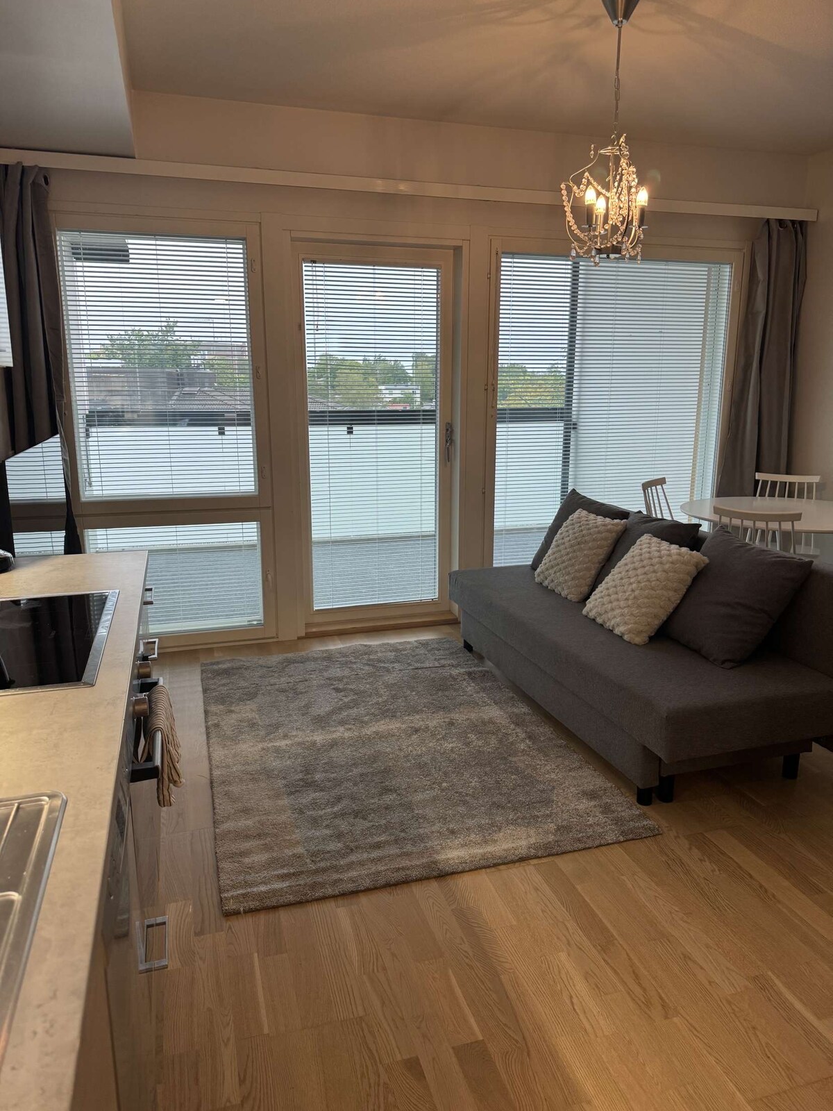 Stylish, bright apartment in a totally new building (completed in November 2023). Livingroom-kitchen, bedroom, bathroom. A double bed (160 x 200 cm) and a pullout sofabed (140 x 200 cm). High comfort: Floor heating, air conditioning, good sound isolation Central: 1 block from the bus station, just a few blocks from the train station and market square Flexible check-in hours