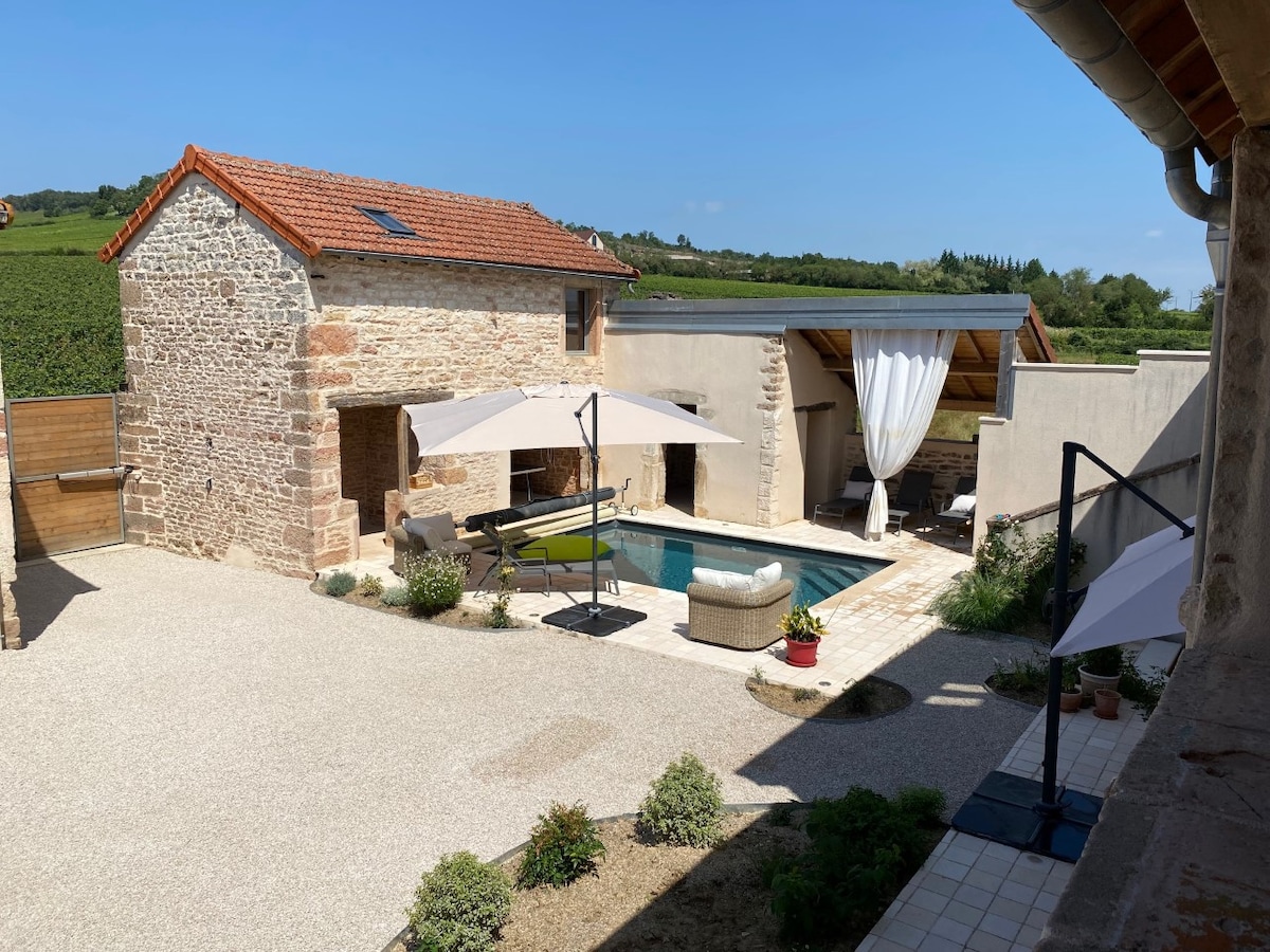 葡萄酒莊園,2021 年翻新,位於夏隆內海岸 (Côte Chalonnaise) 葡萄酒之路上的葡萄酒村吉夫里 (Givry) 的中心。 80 平方公尺的小屋,共用內院,提供戶外家具、烤肉設備、乒乓球桌以及溫水泳池(五月至十月,視天氣而定) 可容納 4 人。設備齊全的廚房、電視客廳和 2 間臥室,其中 1 間帶浴室。 附近有各種設施和活動(自行車、品酒等)
