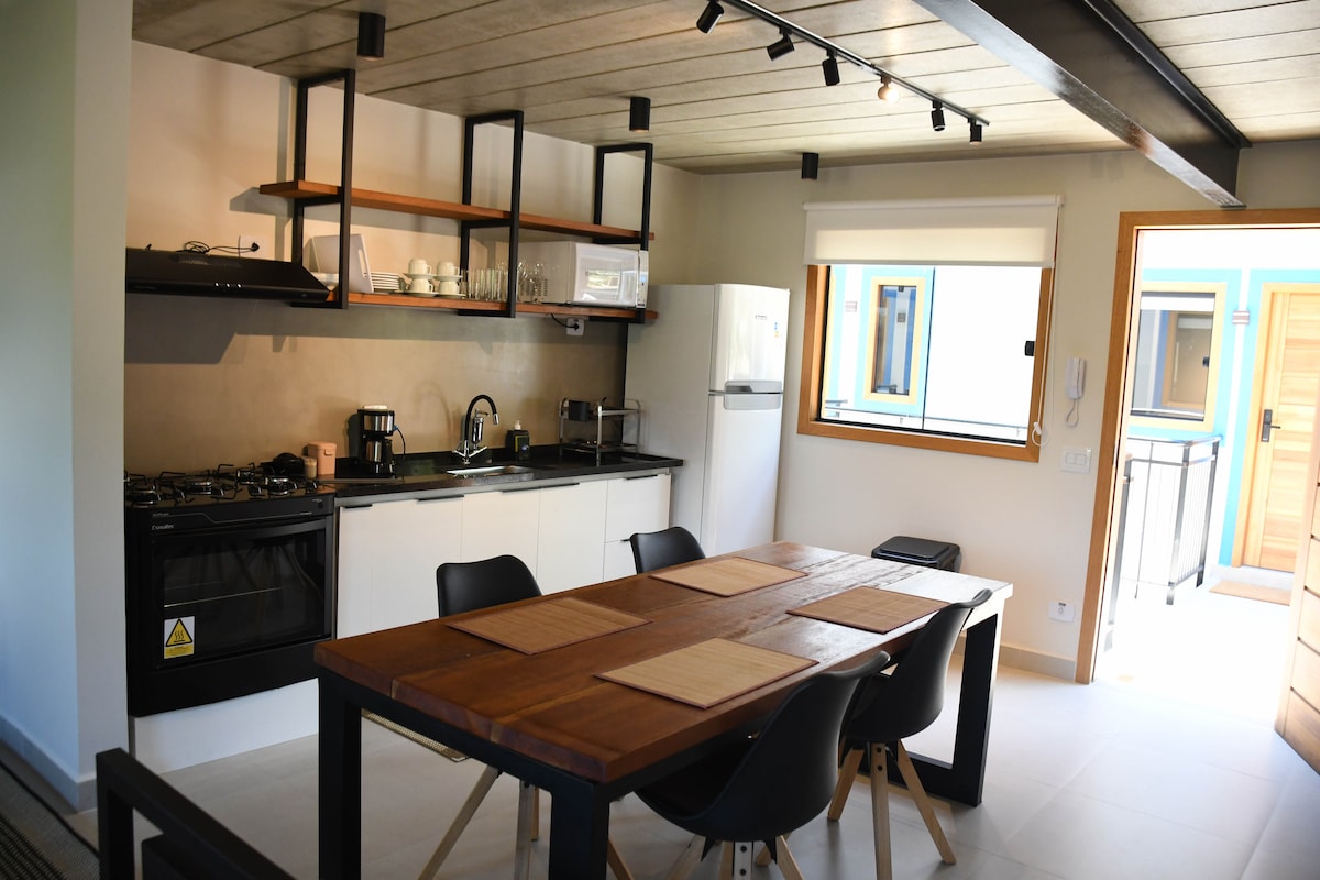 位於高處的公寓房屋,交通便利,距離市中心海灘不到10分鐘。主套房非常舒適,就像一家迷人的酒店。淋浴間配有可容納2人的大浴缸,全玻璃,可俯瞰森林景觀。超級舒適的皇后床墊、全新43英寸電視、空調和露台,可欣賞大西洋森林景觀。河流距離套房幾公尺。兩個網路供應商。可選外部熱水淋浴。