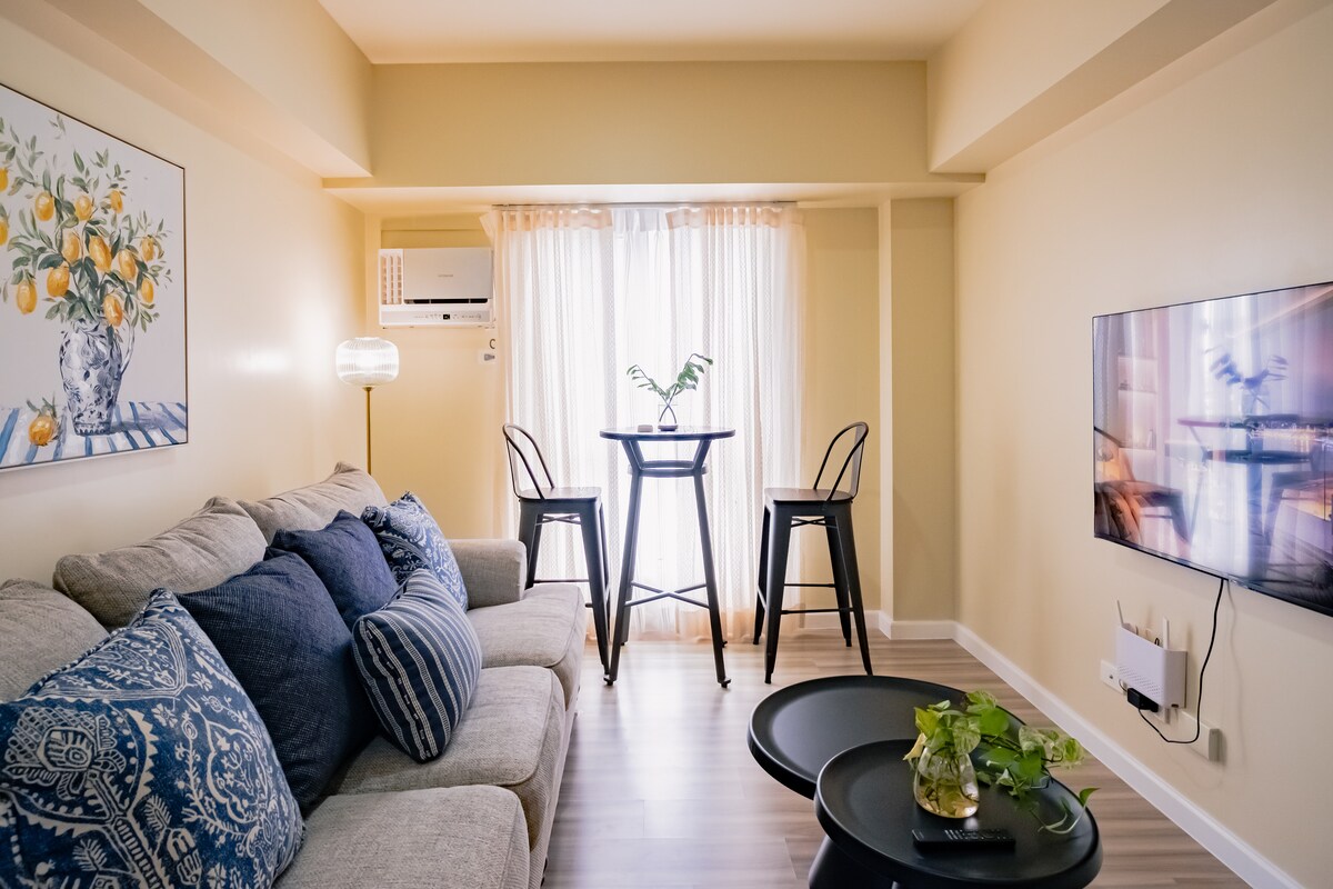 -寬敞的1間臥室公寓,配有1張標準雙人牀、1張雙人折疊牀和1張沙發牀,最多可容納6人 - 200 Mbps網速 - 43吋電視,配備Disney Plus、Youtube和其他網上串流影片 -非常乾淨的臥室、客廳、餐廳和浴室。非常舒適的單位 -步行即可抵達Ayala Central Bloc商場、24小時營業的餐廳、運動酒吧、雜貨店、咖啡店。 -位於宿務市中心和商業中心 -距離機場30分鐘