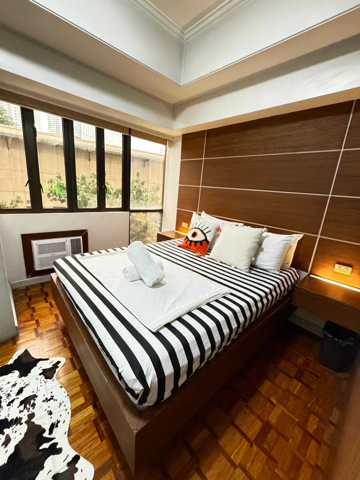 Enjoy a stylish experience at this centrally-located place. Nestled in the city center of Makati, and just above a supermarket, coffee shops (Starbucks, etc), Vikings, Watsons and rows of restaurants and within walking distance from attractions and events. You can’t go wrong with this place. The place is well kept and personally curated and can comfortably fit 2 people. Provision: towels, soap, toothbrush, toothpaste. Hair dryer, hanger, iron, microwave, basic cookware, plates.