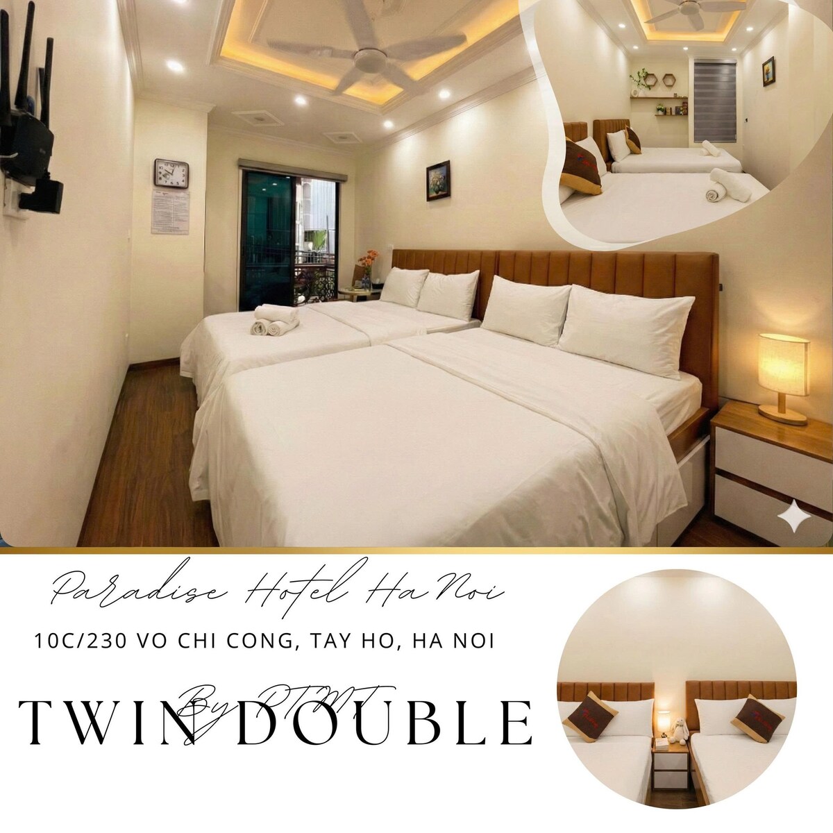 Khách sạn Paradise Hotel Ha Noi – Phòng Delux Twin Room Địa chỉ tại 10C ngõ 230 Võ Chí Công. Với vị trí đắc địa trên tuyến đường huyết mạch đi sân bay Nội Bài và gần trung tâm hành chính/thương mại Lotte Mall và cách Hồ Tây di chuyển chỉ 5 phút bằng xe, việc di chuyển của bạn chưa bao giờ dễ dàng đến thế. Phòng diện tích 25 - 30m2 với 2 giường. Phòng đươc trang bị đầy đủ tiện nghi. Sẵn sàng phục vụ bạn 24/7!