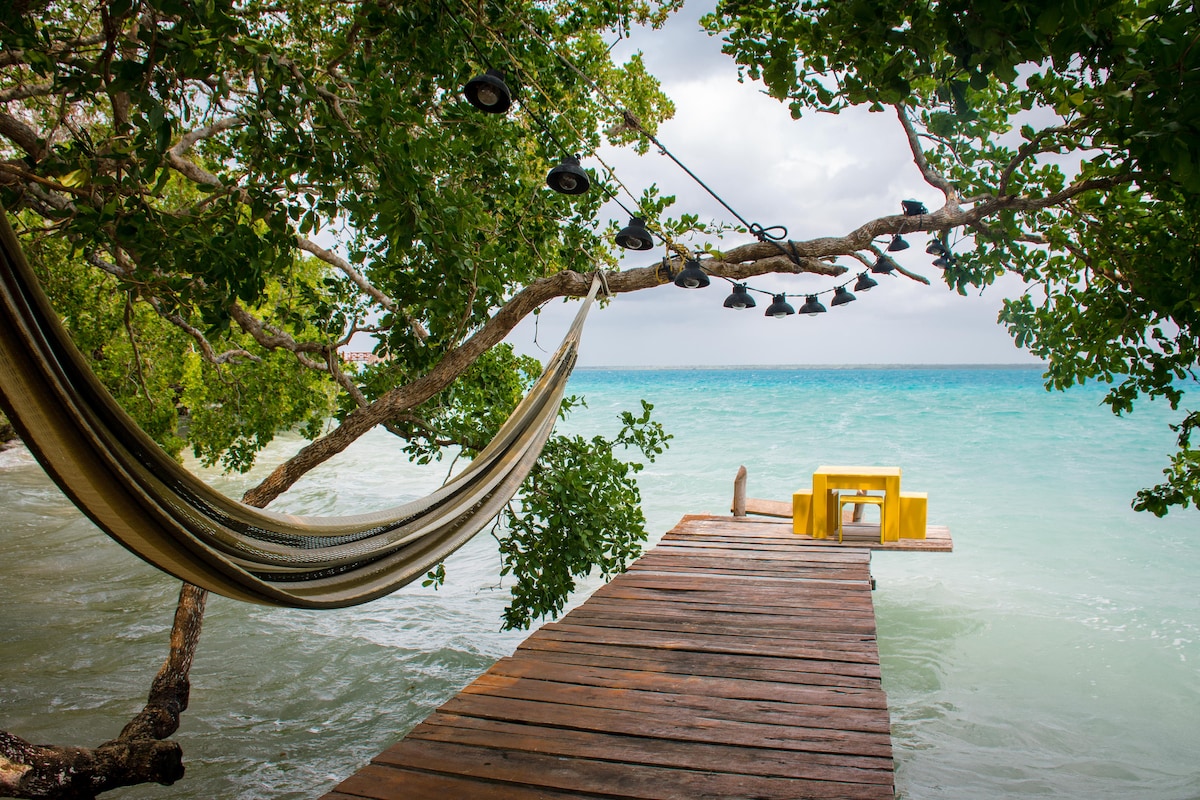 這是一個可通往10公尺外的Laguna de Bacalar的住宿,我們沒有合適的電視。 我們距離巴卡拉爾市中心5.4公裏。 如果有手機信號和WiFi (可能會失敗)。有外部計程車服務,但請攜帶車輛。 配有煮咖啡的炊具和清爽飲料的冷藏箱。 配有加大雙人牀、空調、風扇和獨立浴室。