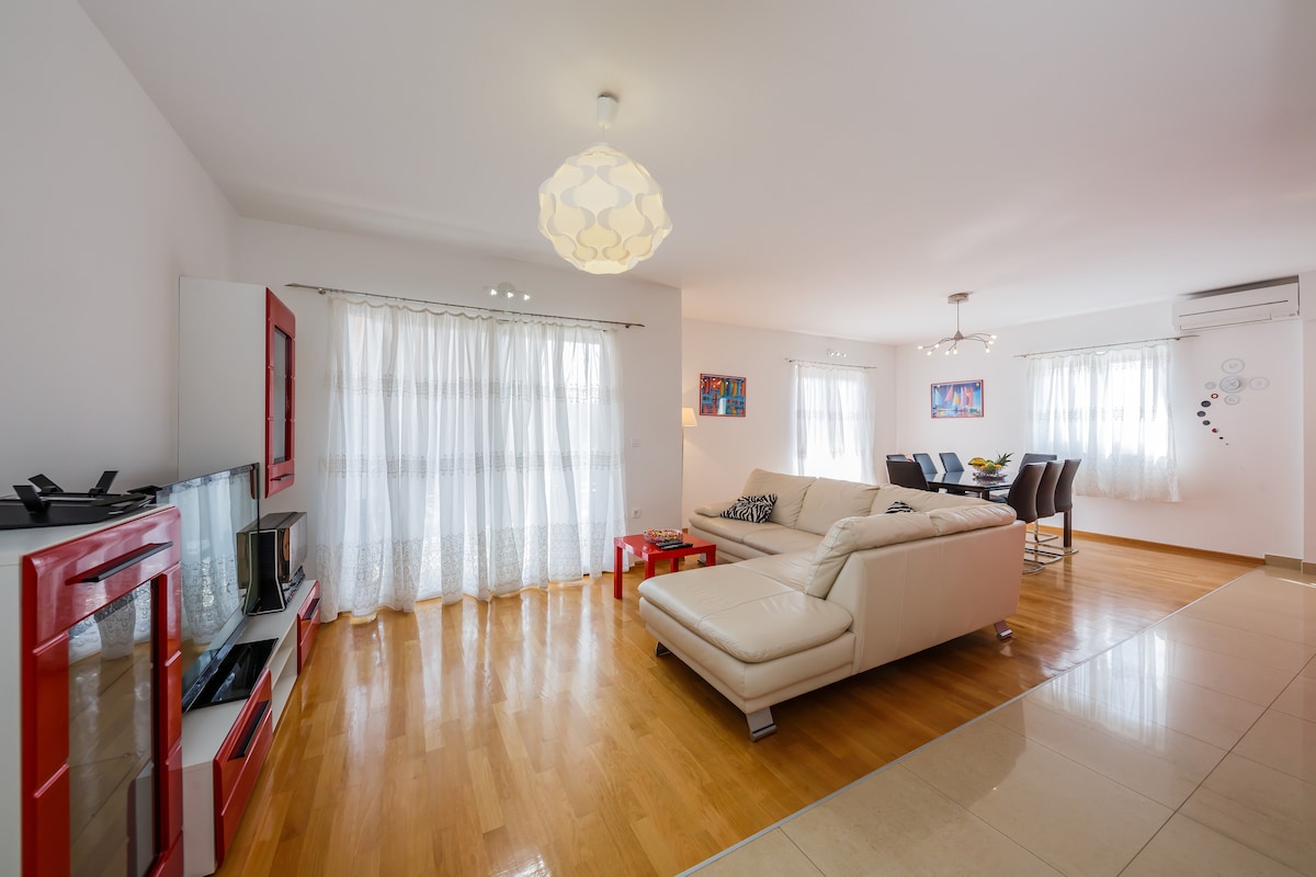 現代化裝潢的公寓有一間配有獨立空調、電視和現代照明的房間。 廚房配備了洗碗機、陶瓷板、微波爐和所有設備。 客廳配有可供第三人使用的沙發、電視和空調。 公寓有美麗的露臺,可俯瞰大海,古老的沙龍和斯普利特。 房客可以使用我們在花園的遊泳池和燒烤。