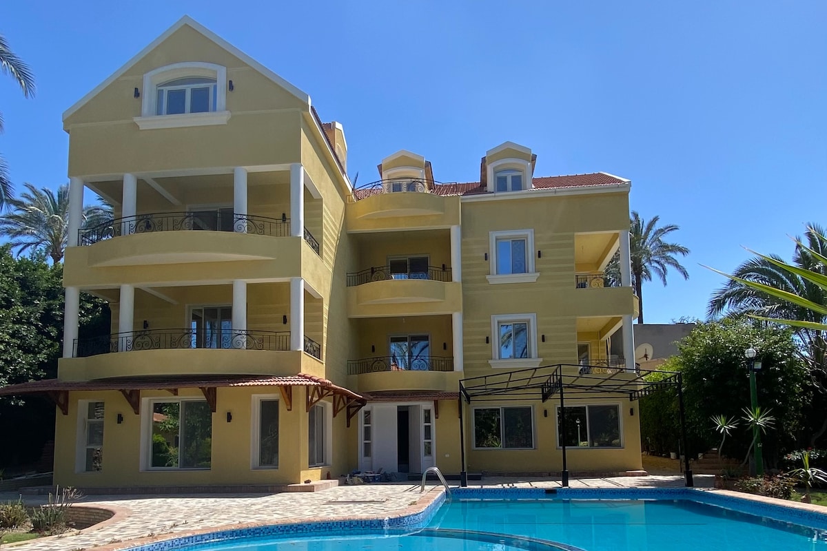 您將獨享整套房源,並且只會與同行房客共用。 美妙而愉快的別墅,配有私人泳池,位於亞歷山德裏亞的Borg Al Arab。 距北部15分鐘車程 別墅位於住宅區( Hawaria )。別墅有5間臥室和4間浴室。住宿提供草坪花園,有樹木。附近有體育活動和外出場所,是與家人或朋友甚至寵物一起在埃及度假的好別墅。