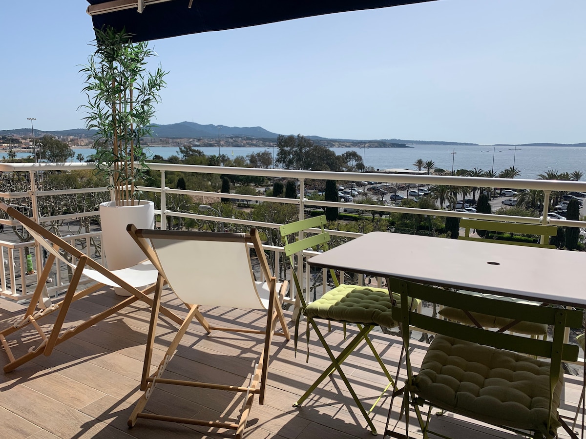 Beau T2 de 48 m2 avec sa terrasse vue mer panoramique. Meublé touristique 3 étoiles. 1er étage sans ascenseur. A 2 mn à pied de la plage. Port de La Coudoulière et plage juste en face. L'appartement est situé entre Sanary-sur-Mer connu pour ses pointus et son marché élu le plus beau de France (<4 km) et le petit port de pêcheur du Brusc et de îles du Gaou et des Embiez. (2 km). Connexion internet par la fibre. Piste cyclable. Station de location de vélo électrique. Arrêt de bus à 2 mn.