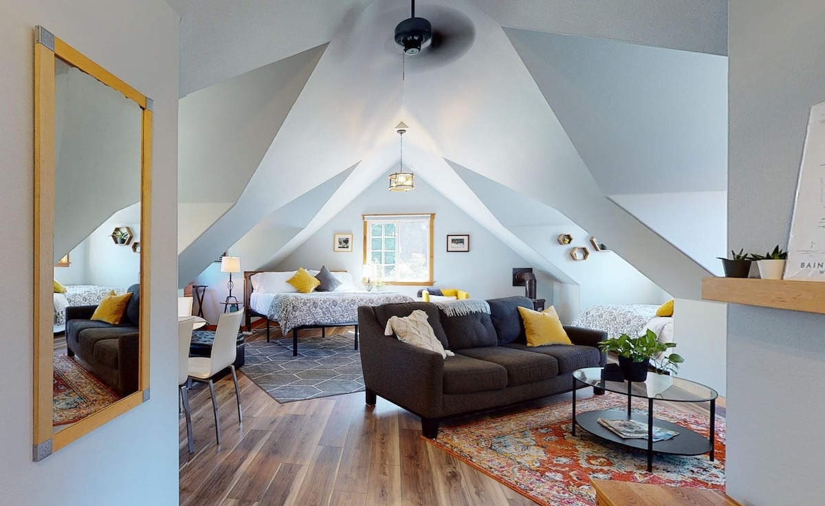 這個獨立且完全獨立的300平方英尺的空間位於主住宅後方100英尺。 被成熟的森林包圍,您會覺得自己住在樹屋裡。 閣樓配有硬木地板、網路、1.8米寬雙人牀、舒適的休息區和小廚房。 Marj對細節的關注和對復古發現的熱愛在迷人而溫馨的空間中顯而易見。 放鬆身心,聆聽房間外的池塘裡的水流。 閣樓可舒適容納單身人士、情侶、兒童或第三位成人。 我們最多接受兩隻狗,但要求除非籠子裡,否則不要讓它們無人看管。 我們也請您讓它們遠離牀和其他傢俱。 便利設備 閣樓配有微波爐、烤麵包機、Keurig咖啡機、熱水壺和迷你冰箱,並備有咖啡、茶、酸奶和燕麥片。 有一張舒適的標準雙人牀和一張雙人充氣Serta牀墊,內部泵可以在您想要的舒適環境下保持壓力。 您可以在有兩張舒適椅子的可擴展桌子上工作或用餐。 還提供網路電視。 衣櫃裡有行李架和熨衣板。 漫步這座美麗的房源,探索獨特而充滿異國情調的花園。 歡迎您與屋主兼首席園丁Nick的私人參觀場地。 我們尊重你的隱私權。 您可以安靜地坐在度假期間,隨意進出。 Fletcher Bay Garden Retreat位於班布裏奇島( Bainbridge Island )中心,距離渡輪碼頭約10分鐘車程。 距離歡樂海灘村( Pleasant Beach Village )和新翻修的林伍德中心( Lynnwood Center )僅幾分鐘路程,包括樹屋咖啡館( Tree House Café )和歷史悠久的林伍德劇 村莊包括有趣的商店、葡萄酒吧和各種餐廳,包括可愛的海灘別墅餐廳。 沃爾特雜貨店( Walt 's Grocery )近在咫尺,您可以在這裡挑選必需品,品嚐沃爾特的家庭啤酒啤酒和大量精選葡萄酒。 如果您想進一步探險,您可以參觀大森林( Grand Forest )、備受好評的Bloedel保護區( Bloedel Reserve )、高爾夫球場、古樸的班布裏奇島( Bainbridge Island )市中心和備受好評的全新班布裏奇島藝術博物館( Bainbridge Island Museum of Art )。 附近的城鎮包括Poulsbo和Port Townsend ,這裡有更多的購物、旅遊和美食。 當然,乘渡輪35分鐘即可抵達西雅圖! 乘船或從基薩普半島( Kitsap Peninsula )抵達。 如果您不想開車,請在班布裏奇島渡輪碼頭搭乘計程車或騎自行車(可存放行李)。 此旅居的班布里奇島市短期租賃許可證號碼:P-000090 美食 您的房東會確保您的房源為您的早晨準備一些基本早餐,包括咖啡用品、燕麥片和酸奶。 您可以在早晨品嚐咖啡的同時規劃您的一天!