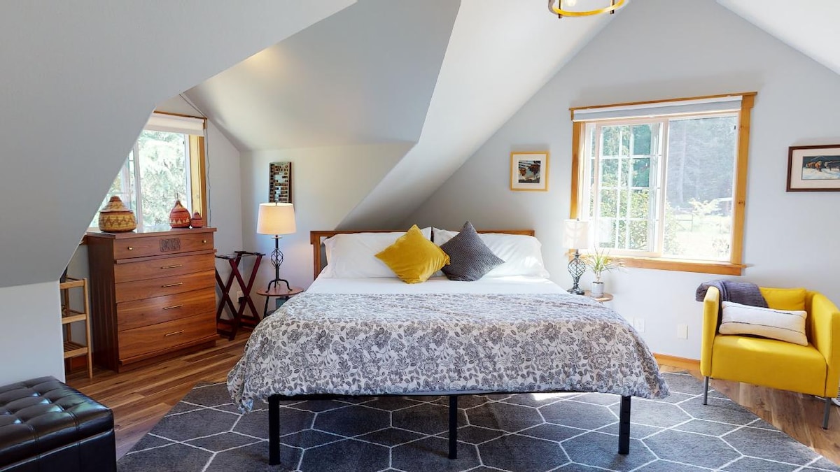 這間光線充足的加大雙人牀套房位於B-hive ,讓您睡個好覺。 剛剛更新,位於班布里奇島(Bainbridge Island)的中心,坐落在26英畝的豐饒農場(Bountiful Farm)。 有時用作婚禮場所,周圍環繞著成熟的景觀、花卉和動物。 藝術家度假、家庭短途旅行、農場動物體驗或只是遠離城市的放鬆度假,我們認為您會在B-hive找到您需要的東西! BI WA短期租賃證書# P-000059