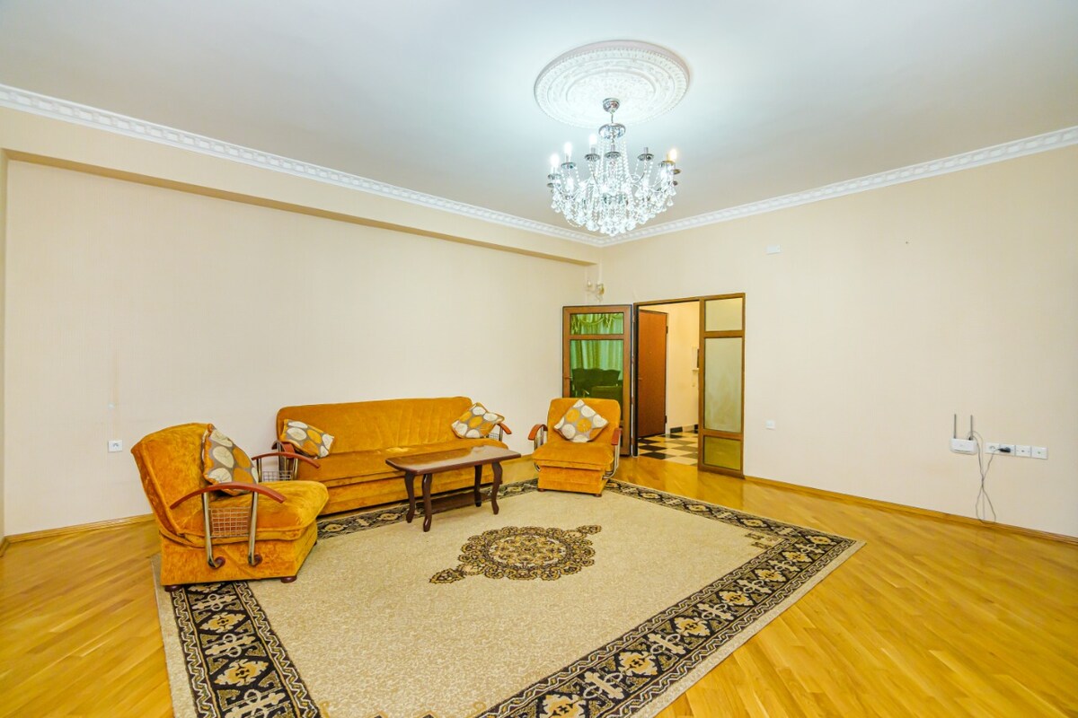 在市中心,二樓, 2個陽臺(每個房間都有陽臺) ,步行3分鐘即可抵達大道和巴庫港和新月商場,毗鄰5月28日地鐵和28個商場和土地標誌,高天花板4公尺,隔音,每個房間都有空調和暖氣Combi ,公寓配備您所需的一切:洗衣機、冰箱、瓦斯爐、微波爐、智慧電視+ 240個有線頻道和高速網路: CityNet、4G和5G Wifi。 附近有24小時市場和藥店