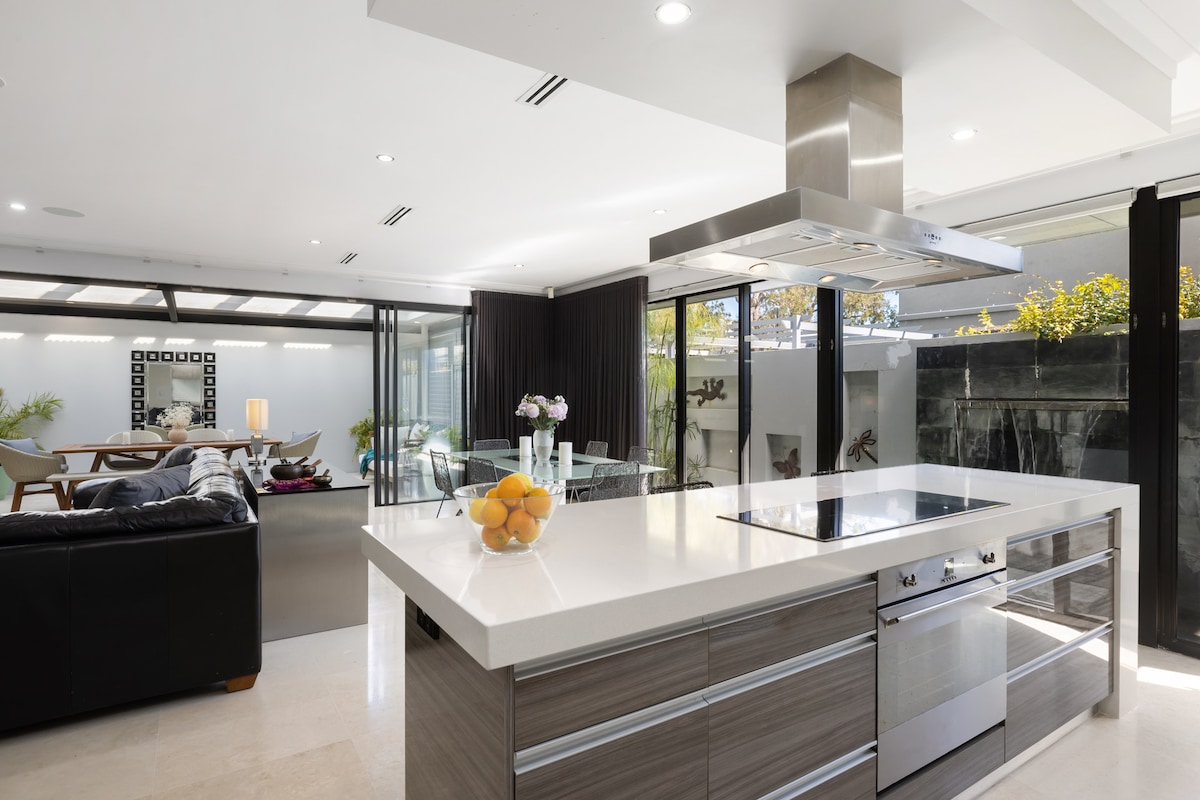 Relax in comfort and style in this immaculate beach side abode. Breathe in the ocean air, enjoy the garden terrace and barbecue or walk out your front door and enjoy iconic City Beach, local cafes and restaurants, parks and the beachfront boardwalk. An easy 10-15 minute drive into the CBD. We really enjoy meeting and hosting guests in our new beach house. As award winning architectural and interior designers working in the hospitality industry, we designed the private apartment to offer a relaxing escape with all the goodness and comforts of home. The casual resort style accommodation is fully self contained and well appointed, perfect for business, holiday travellers and families to kick back and enjoy the wonderful beachside location. Contemporary coastal style décor and accommodation comprises: Master Bedroom with Queen size bed, bedside tables, console, occasional chair and large fitted wardrobe. Extra Large Bedroom with two single beds, bedside table, storage credenzas and large wardrobe w/toy storage and space for kids to play. Stylish contemporary bathroom with vanity, storage and shower. Spacious and bright open plan layout with luxury finishes Full Gourmet Designer kitchen with European appliances Dining table/area for four Oversized Lounge area with large TV/DVD NETFLIX and WiFi Original artwork by local artist Stephen Draper. Study nook and desk with shelving and mobile pedestal -if you really need to work ! A secluded, verdant tropical garden terrace with alfresco dining and bbq facilities lets you enjoy the spectacular sunsets and listen to the sounds of the surf with a quiet glass of wine . Life's good :) Our guests have their own private front door to come and go as they please with private access to all the accommodation. Use of our pool and pool house deck by arrangement. We will personally welcome you and provide our recommendations of local eateries, bars, entertainment, sporting and shopping facilities. As well as places of interest to visit + things to do with kids! - We can provide bikes, boogie boards, brolly, beach towels, bucket and spades. We are only a call away and generally on hand to help you enjoy your stay. I love the laid back, friendly beachside vibe of south City Beach! A two minute walk and you’ll have the sand between your toes. There’s plenty of eateries to choose from, a nearby 24/7 gourmet supermarket and easy access to CBD, Freo and Kings Park. A bus stop is 100m from our house (BUS 82) travels to the City Centre in 30 mins. The bus stops in Subiaco where you can connect to the train to go to the City, Elizabeth Quay,Claremont, Cottesloe and the fishing port of Fremantle OR the spectacular new Optus footy Stadium and the Crown Casino and Resort. Off Street parking is available and we suggest you consider a hire car if your stay is for longer than a few days. If free we are happy to drop you off on route or you can Uber. Single level open plan living areas with two steps up to Laundry and Bathroom. We operate a bio chemical water treatment system i.e every 3-4 times you use the bathroom the pump will operate for 3-4 seconds w/minor residual noise.