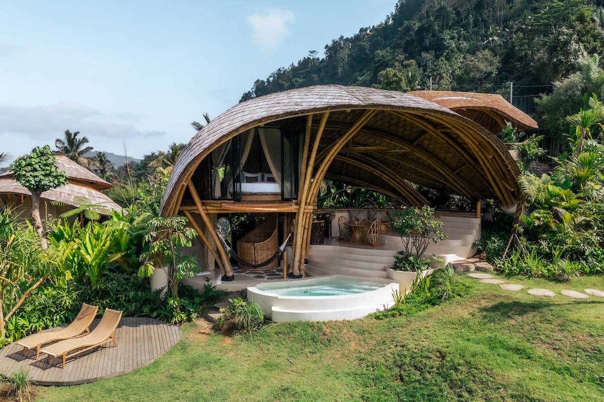 Experience ultimate relaxation in the heart of Bali at exclusive luxury bamboo villa in Sidemen. Wake up to a breathtaking view of Mount Agung right from your bed, and unwind in your private Jacuzzi hot pool surrounded by lush nature. Enjoy a complimentary breakfast each morning, and savor delicious meals at our restaurant prepared with fresh, organic produce from our own farm. A dedicated butler is always on hand to make your stay seamless and truly indulgent.