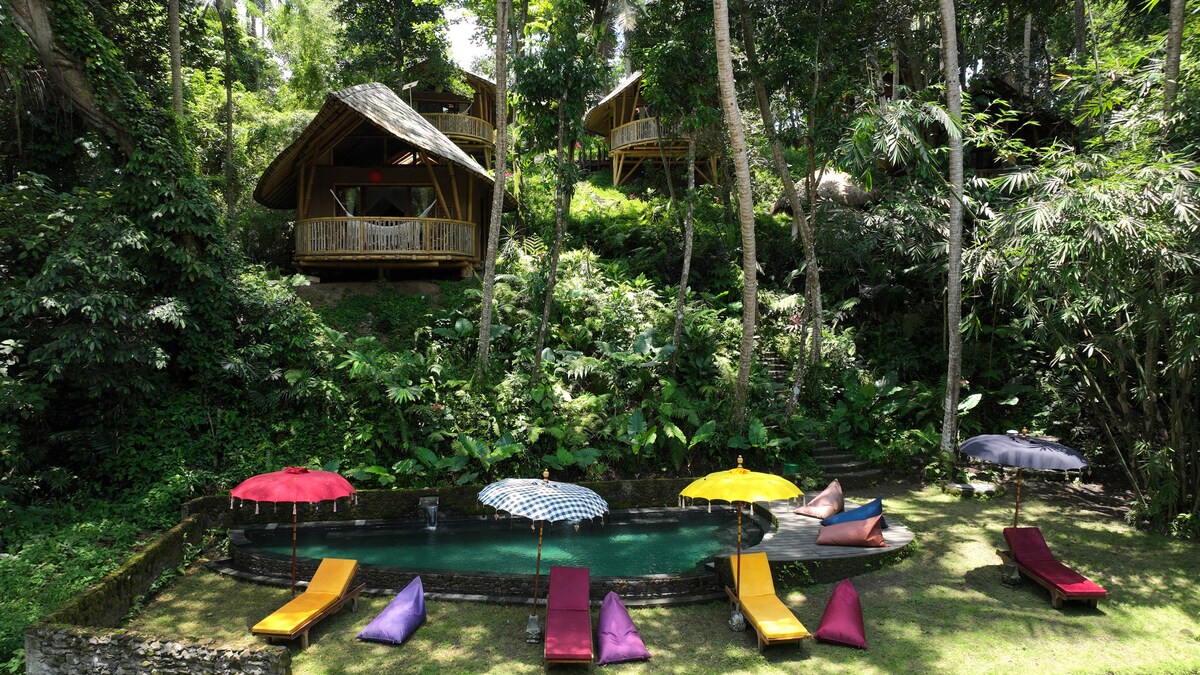舒適的河景竹屋,是5間獨立小屋的一部分,坐落在樹林中。以永續的方式建造和裝備,對環境的影響最小 在私人陽臺或休息室的舒適吊床上觀鳥,俯瞰12公尺無邊際泳池 一旦被大自然重新激活,您可以向北前往巴厘島烏布鎮中心繁華的文化中心和美食夢想,或向東開車20分鐘到最近的薩巴黑沙灘