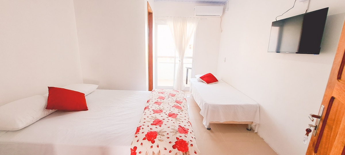 三人房有雙人牀和額外的單人牀。 未使用額外牀位時,請將其從房間中移除,以便為房客提供更多空間和舒適度。 8歲以上的額外房客每天收取60雷亞爾的附加費 *俯瞰Mampituba河和Serra do Mar的陽臺 *空調 *吊扇 * SmarTv *冰箱 注意:這個房間與另一個房間共用浴室。