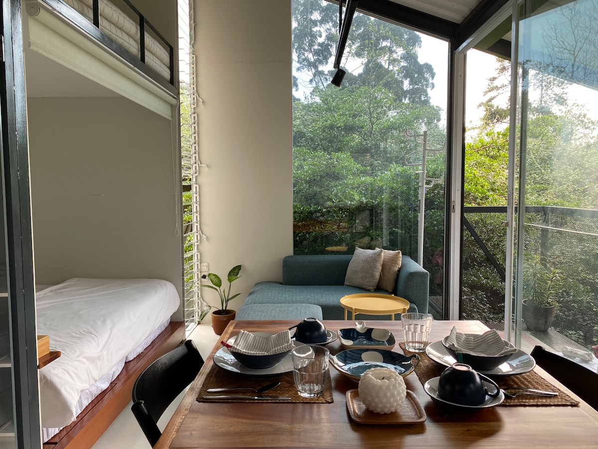 公寓式小亭子,配有雙人牀、浴室、沙發、餐桌和食品庫,位於達戈山的獨特集羣中,有涼爽的自然氛圍,有很多樹木,安靜舒適。 距離ITB校園很近( +/- 10分鐘)。 非常適合與家人、親戚或朋友一起工作或度假的地方。
