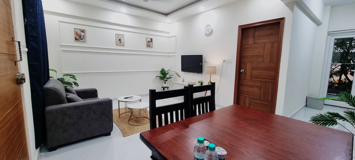 Welcome to our brand new, spacious 2-BHK apartment, ideal for families and couples seeking comfort and convenience. The bedrooms have king / queen size beds with soft orthopedic mattresses for a restful night's sleep. Relax in the large living room with a 43-inch Smart TV, lightning-fast WiFi and a dedicated dining area. Comes with two super clean bathrooms stocked with bath essentials. The fully equipped kitchen includes high-quality appliances and crockery for your culinary adventures.