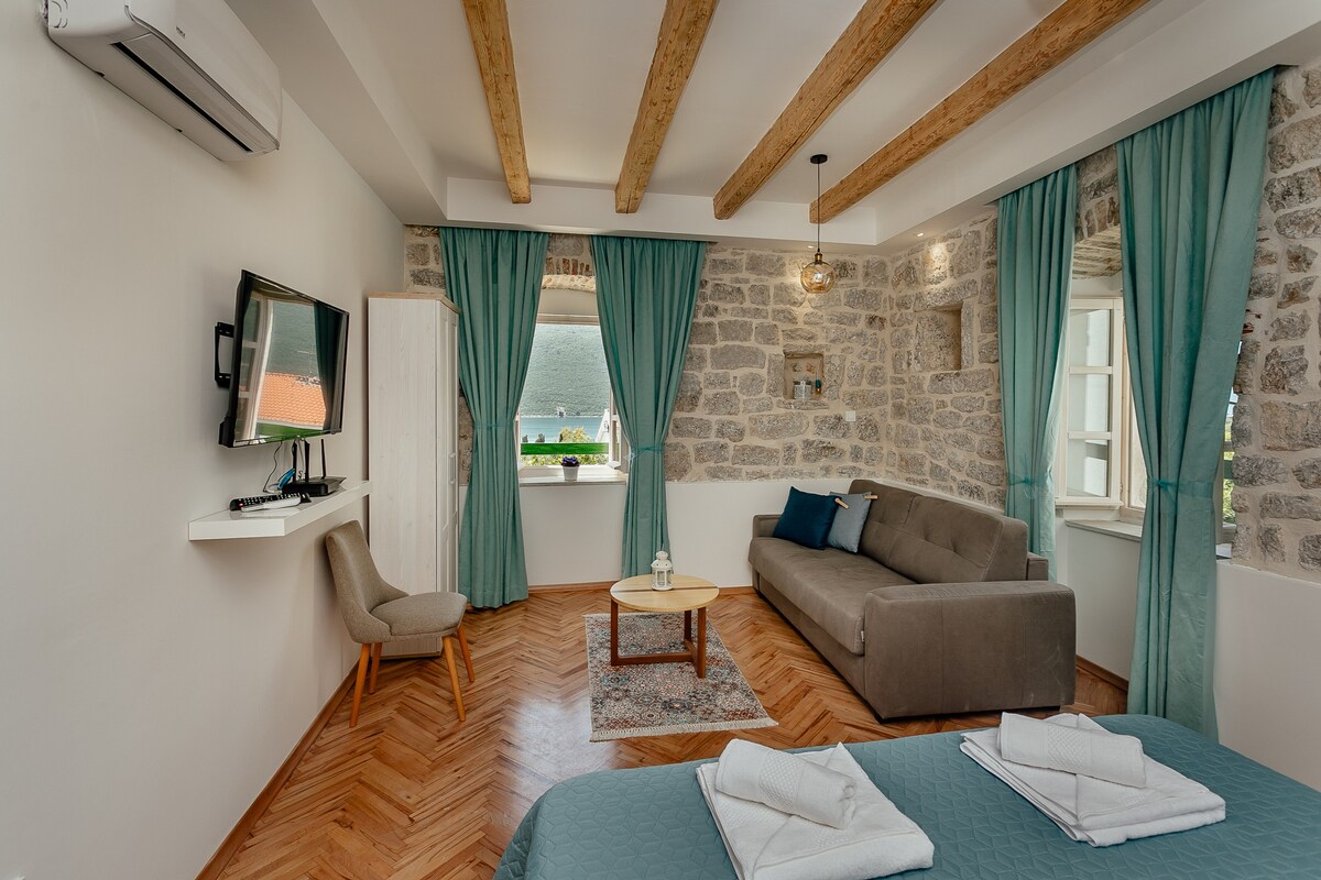 歡迎來到你在Baošići的夢想度假勝地。 這間2間睡房公寓位於一座經過精美翻新的歷史建築內,擁有驚人的現代設計、溫馨的觸感和無間斷的海景。 踏進陽光充足的室內空間,欣賞大膽的線條、精心挑選的傢俬和柔軟的質地。 在時尚的廚房烹調美食,欣賞美景,並在海浪聲中入睡。 沿著海濱長廊漫步,享受當地咖啡廳、酒吧,當然還有海灘。