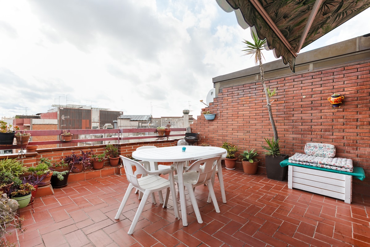 這間90平方米的波西米亞式複式單床公寓,從大型植物覆蓋的露台可俯瞰整個城市的美景。 步行即可抵達蘭布拉斯大道(Las Ramblas)。 樓下有一間配有標準雙人床的睡房,旁邊是一個長陽台,樓上則是另一個開放式客廳,旁邊是露台。 有智能電視、免費WiFi、洗衣機和烘乾機。(請注意:它位於6樓,沒有電梯)。每晚價格包括旅遊稅(每人每晚6.25歐元)。