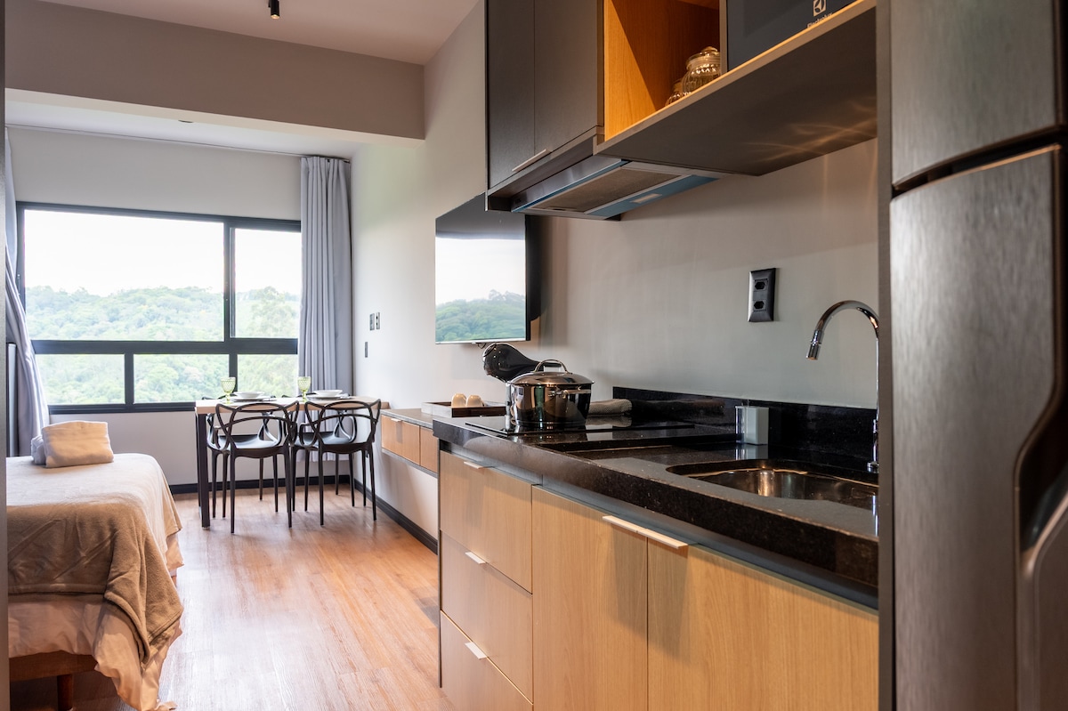 Studio bem localizado próximo a Alphaville. Equipado com: Cama box casal Colchonetes Estação de trabalho Ar-condicionado Quente e frio TV 69” Wi-Fi Móveis planejados Estação de trabalho Cortina blackout Mesa de jantar Microondas Cafeteira nespresso Cook top por indução Depurador Sanduicheira Secador de cabelo Ferro e tábua de passar Curta a estadia no lindo condominio Selenita com área de lazer completa. Piscina Academia Salão de festa Churrasqueira Mercadinho Lavanderia Sala de jogo