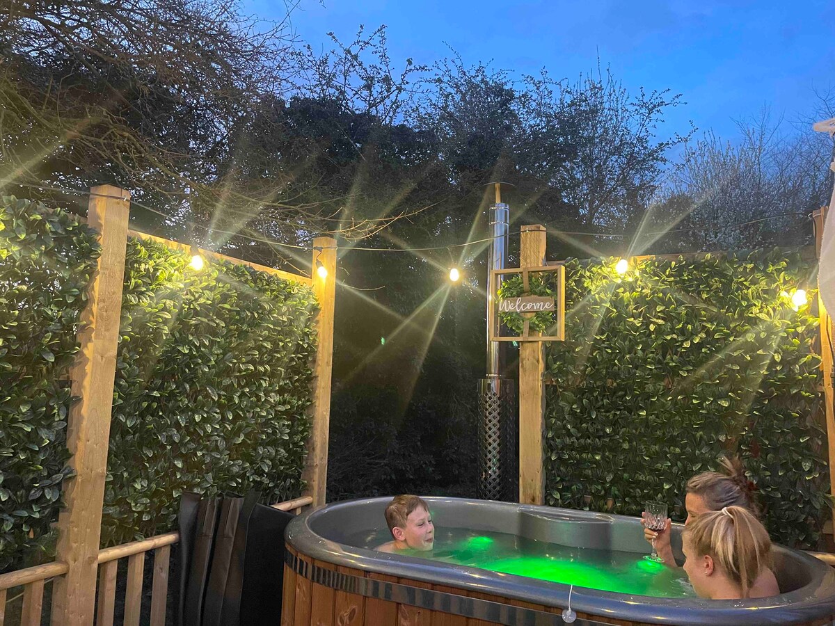 We invite you to come for a relaxed stay at our luxury log cabins, complete with a wood fired hot tub and fire-pit in your own private garden. Set amongst 24 acres of private land, this retreat offers quiet trail walks, nature watching in a mini woodland, around a small lake and across peaceful grassy fields. The cabin has high ceilings, a log burner and comfy beds for you to curl up in. We are pet friendly 🐶♥️ *We require a safety deposit of £50, which is explained in the “property” section*