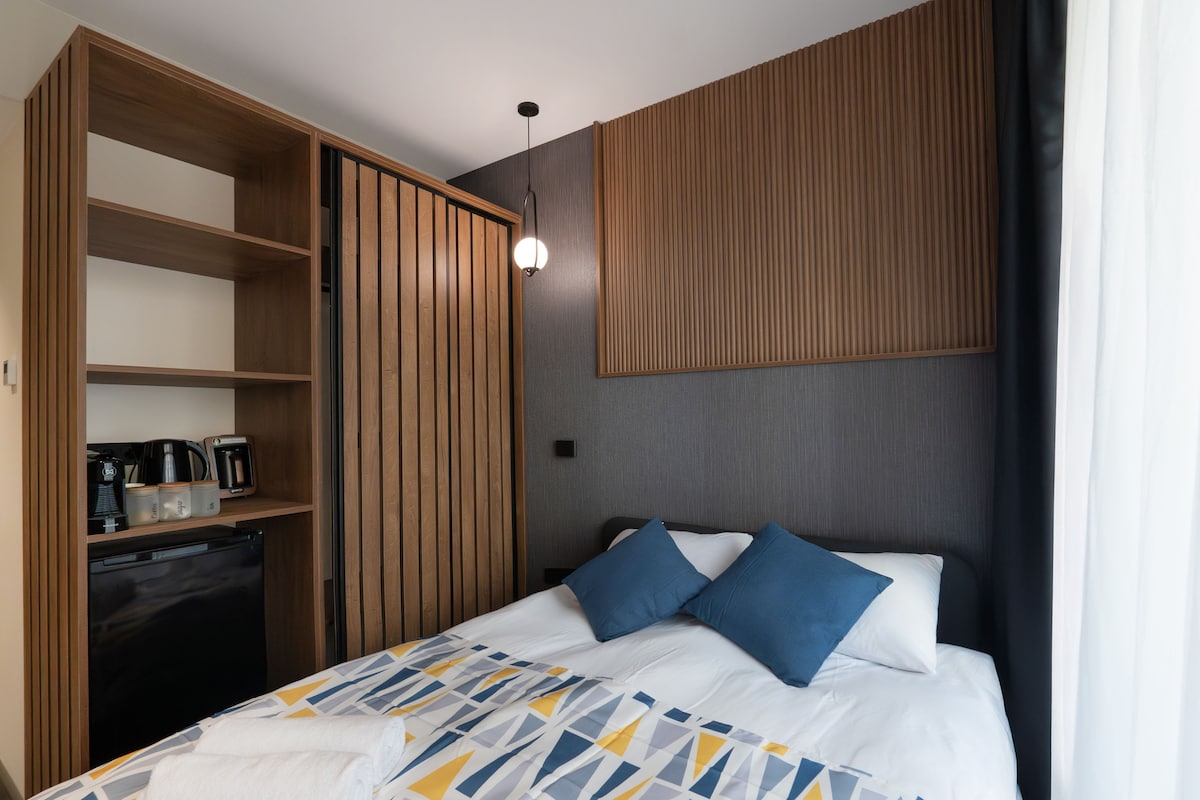 Welcome to Green Heaven – a calm, hotel-style room with balcony and access to a newly built shared drop pool surrounded by nature. Designed in soft blue tones, it’s perfect for solo travelers or couples seeking peace and comfort. Enjoy the fresh air, relax in a cozy bed, and stay connected with Wi-Fi and smart TV. While there’s no kitchen, great cafés are nearby. A quiet retreat just minutes from Batumi’s center.
