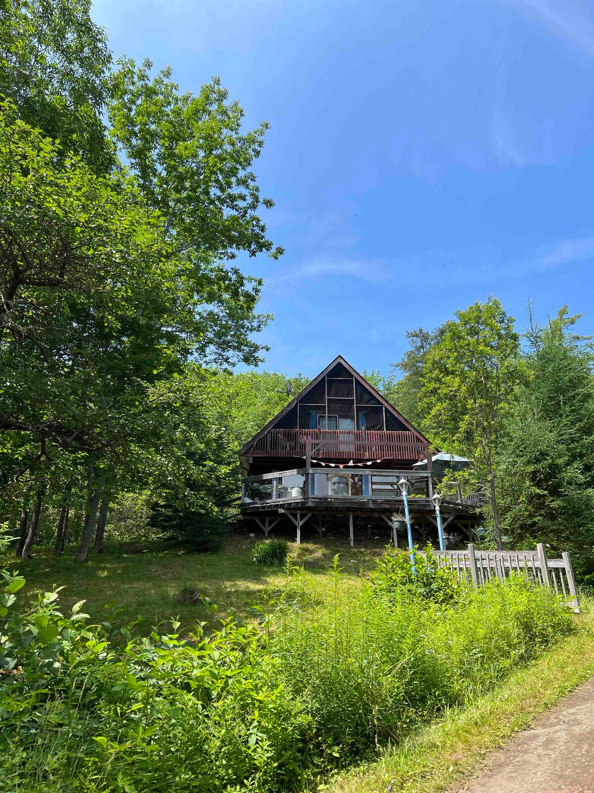In the rural Acadian community of Clare, you will find our fully equipped, recently updated, 1 bedroom + loft A-Frame style chalet sitting on a quiet lake. The beautiful view can be enjoyed from wall to wall windows, wrap around deck, or while sitting in the hot tub. Loft: 1 king & 1 single bed - excellent for traveling with children. Downstairs bedroom: 1 queen bed. Living room: double pull out sofa & futons. We live next door so let us know if anything is missing during your stay!