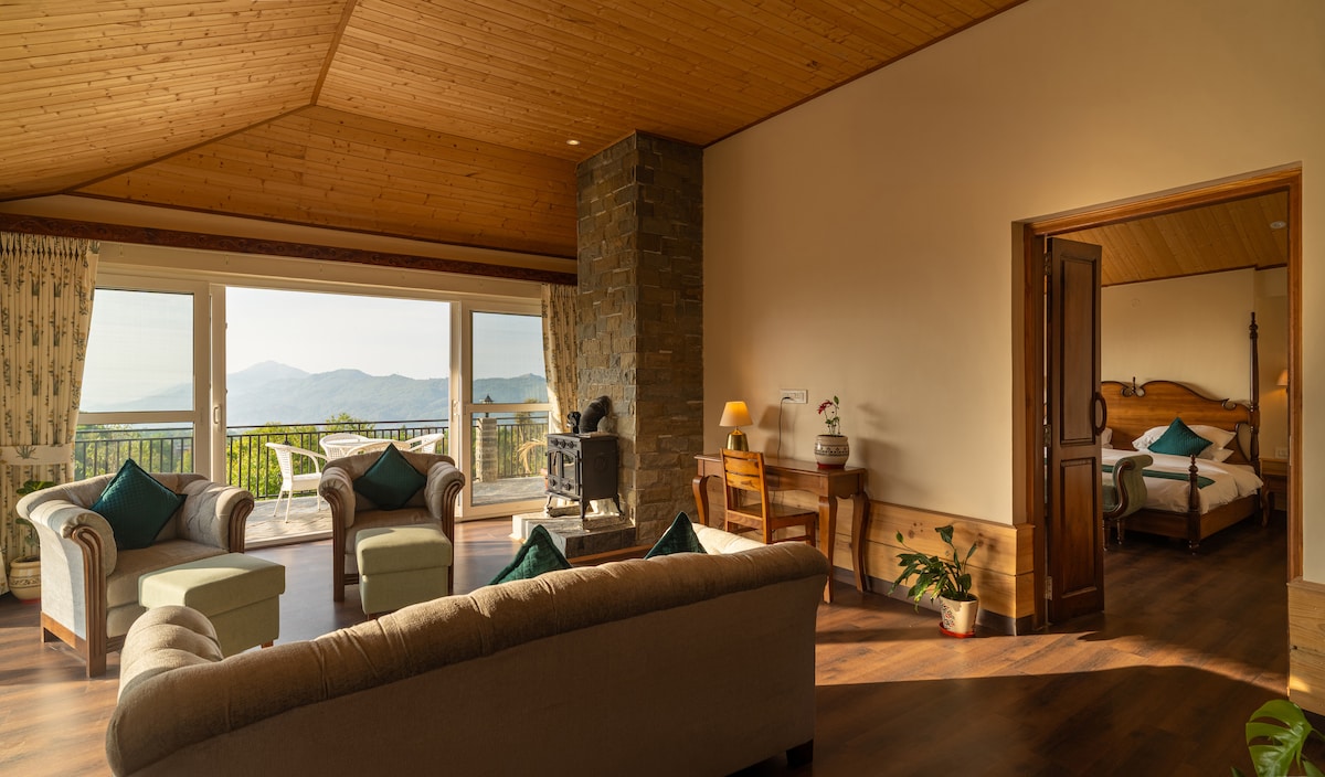 Enjoy a peaceful stay in this spacious room with stunning mountain views. The room features a comfortable king bed, cozy seating area, large windows with natural light, and a private balcony overlooking the valley and snow-capped mountains. Guests also have a modern attached bathroom with hot water, a workspace, and a TV for a relaxing stay. Perfect for couples, families, or travellers looking for a calm mountain getaway.