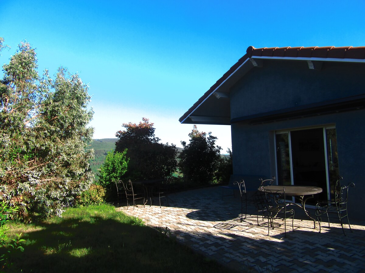 GITE pour 6/8 personnes, maison de plein pied, dans le parc du Pilat. 2 chambres avec lits doubles 140 et 1 avec lit en 120 + lit en 90. Chaque chambre a sa douche italienne et lavabo. possibilité de deux couchages en sus, car convertible lit 140 au salon. Terrasse tables, chaises, barbecue grill et plancha. A proximité des pistes de ski de fond du bessat. A 30 mn de Saint-Etienne et 50 mn de Lyon. Plusieurs sentiers de randonnées aux pieds de la maison. Terrasse ensoleillée.