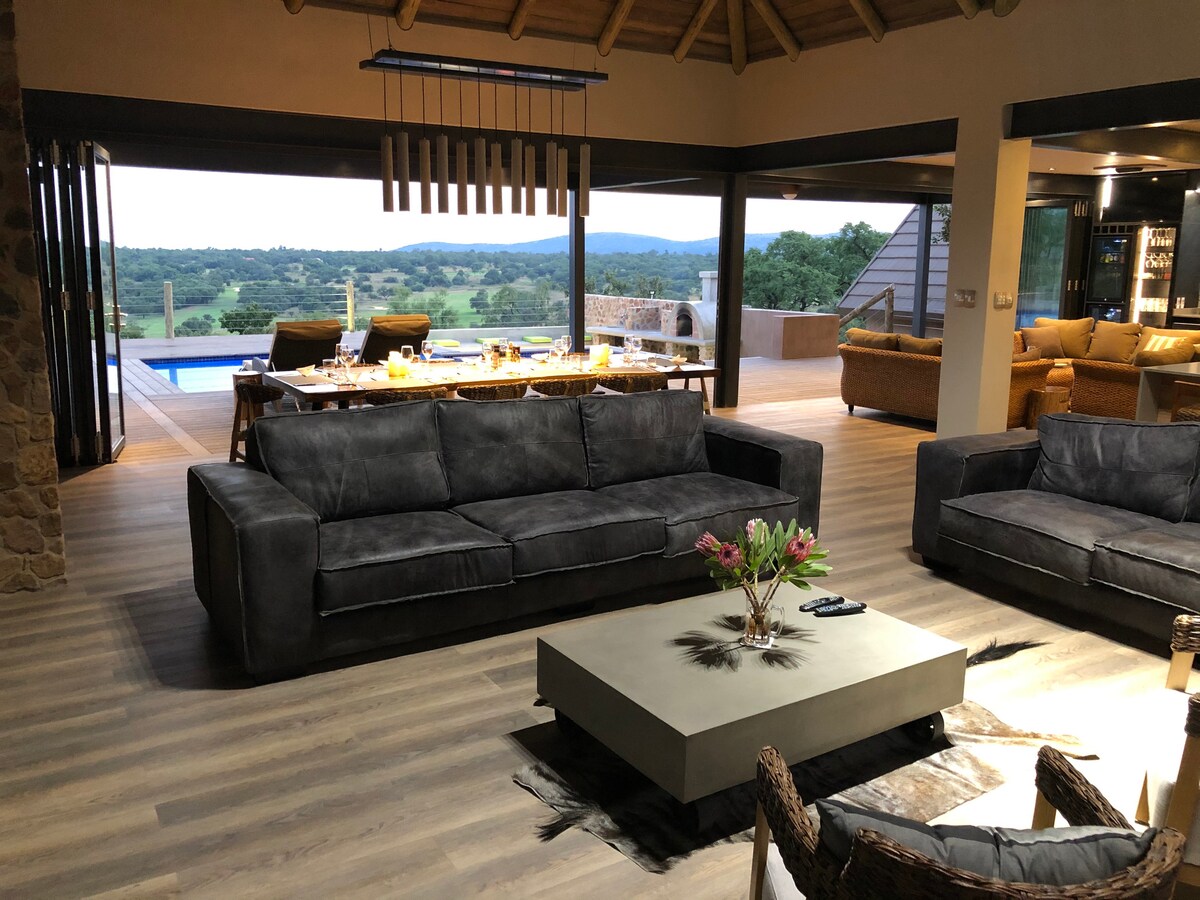 林波波(Limpopo)叢林中心的豪華度假屋。 逃離城市,享受高爾夫、大自然、陽光、野生動物、叢林火焰、觀賞銀河系、山地自行車,並在奢華的環境中探索大自然。現代開放式度假屋,配有設備齊全的廚房,流入客廳、配有燃氣壁爐的餐廳、配有製冰機的酒吧區域,是娛樂和慶祝特殊場合的理想選擇。 通往有頂棚的大型私人露臺。