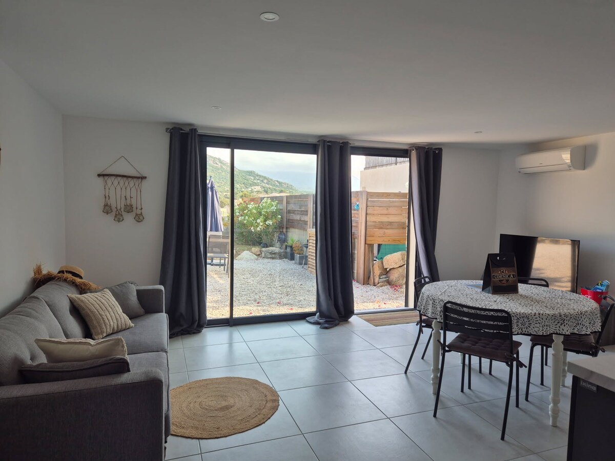 我們的住宿可欣賞壯麗的山景。您將與我們共用 6X3 公尺的泳池。步行即可抵達海灘。我們對房源進行了全面翻新,裝飾獨特而精緻。臥室有 2 張單人床,客廳有 1 張 140X190 的沙發床。露臺配有扶手椅、桌子、椅子、烤肉架。獨立於一個巨大的花園中,您將享受絕對的寧靜。您的孩子和寵物可以安全地在花園中玩耍