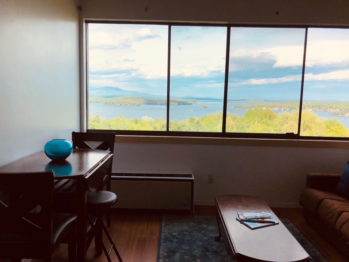 This top floor-corner unit is a peaceful oasis. The elevator will whisk you up to your private studio apartment. Your view is breathtaking in any season....See the autumn leaves change in New England.....Ski nearby Gunstock in the winter, enjoy the (hilly!) walk to Weirs Beach in the summer. Centrally located in the Lakes Region and all its attractions, shopping and restaurants! close to Weirs Beach, 4 miles to the Bank of NH Pavilion/Meadowbrook concert venue, 8 miles to Gunstock Mountain.