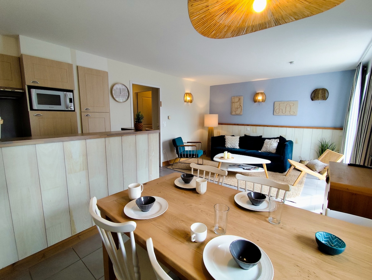在現代舒適的環境中探索勒圖凱市:我們設備齊全的70平方公尺公寓於2018年全面翻新,並精心裝飾。它位於二樓,有一個大型閣樓式明亮的起居區和2間臥室。最多可入住 5 人(如果有小孩,則可入住 6 人),非常適合情侶和家庭。 位於勒圖凱(Le Touquet)市中心,距離聖讓街(Rue Saint-Jean)20公尺,距離海濱200公尺:餐廳、酒吧、商店、有蓋市場...步行不到5分鐘!