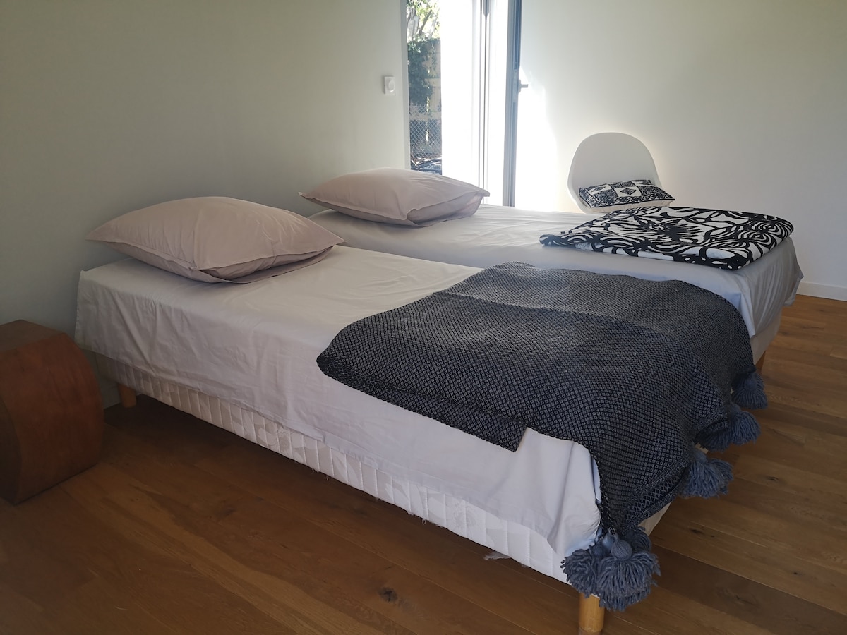 位於Ploemeur入口處的岸邊,距離Kerpape海灘5公裏,距離前往Lorient的巴士50公尺。 最近有獨立入口(密碼鑰匙盒)和獨立露臺。 定性服務。非常寬敞的臥室和浴室/廁所( 26平方公尺)、更衣室、書桌、電視、WIFI。 牀160、新寢具、棉質紗布、毛巾。咖啡機和膠囊。 我們期待著歡迎您就我們地區的遺產提供建議, Annie