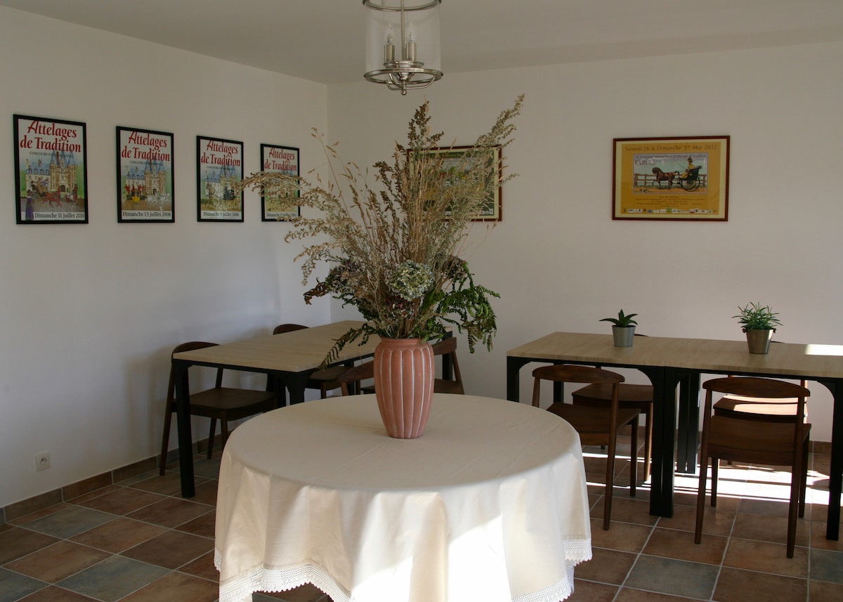 我提供一間 14 平方公尺的寬敞房間(配有 160*200 的床、電視和免費 WiFi),位於我家的一樓。這一層將為您保留。您將擁有配備雙洗手台和廁所的私人浴室。 如果您願意,您也可以使用封閉式停車場。 早餐在客廳供應,如果天氣允許,也可以在露臺上享用。 價格包括住宿稅和 2 人的早餐。