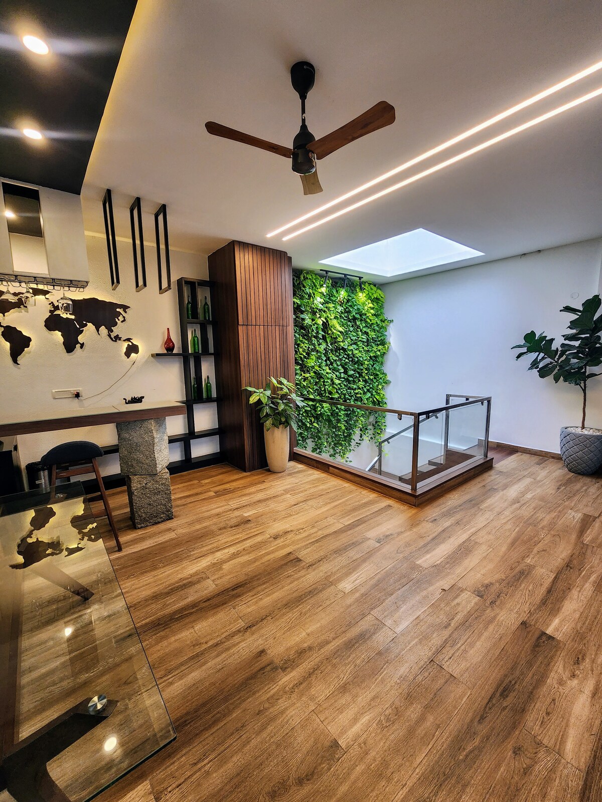 This is a luxurious & spacious penthouse situated in the center of Bangalore and it has 3 levels with plenty of private outdoor space. The greenery and the natural light coming from the skylight and huge glass windows are the highlights. The house is fully loaded with all the modern amenities required for a great stay. Daily housekeeping, 24/7 power, lift, car parking, modern kitchen, desk space for work, high-speed internet, 65 inch TVs, JBL 5.1 soundbar are some of the standard amenities.