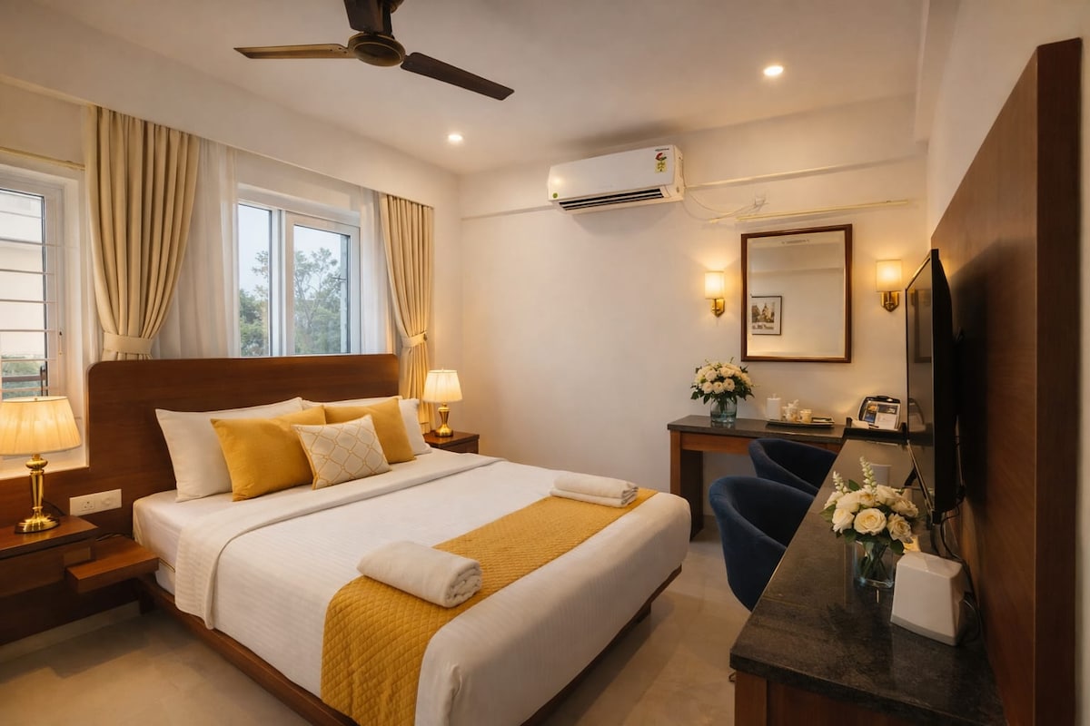 Deluxe Room with Balcony | Free Breakfast | 100 Mbps Wi-Fi Stay comfortably at Hotel Elevate Inn near Bangalore International Airport (BLR). Our Deluxe Room features a private balcony, comfortable king-size bed, in-room work desk, and high-speed 100 Mbps Wi-Fi—ideal for business and transit travelers. Enjoy a complimentary breakfast and a clean, modern space designed for a peaceful and convenient stay close to the airport.