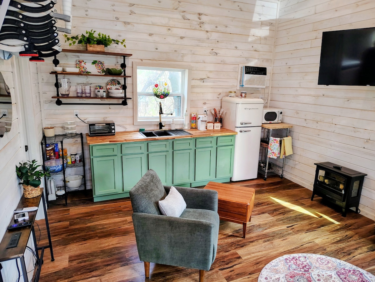一間臥室、一間浴室小屋,客廳有沙發床(適合兒童)和小廚房。 小屋配有咖啡壺、微波爐、小型冰箱、電動平底鍋和刮刀、碗碟、餐具、洗碗精、碗碟排水管、床單和毛巾(僅供室內使用)。我們不會提供任何額外的烹飪用品。 小屋外面有野餐桌、火坑和烤架。請自帶木炭、打火機液、火柴/打火機和室外烹飪用具。