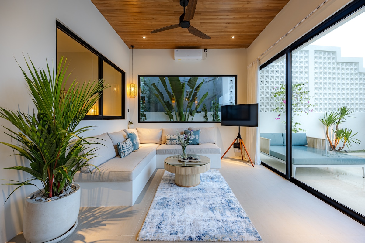 全新現代美學別墅 弧形邊緣、圓弧、白色冷色調、溫暖的木質裝飾和茂密的綠色植物。 這別墅經過精心設計、建造和維護,讓您舒適入住。 在坎古市中心的安靜街區享受您的住宿: -步行5分鐘即可抵達Nelayan海灘,享受衝浪和日落 -步行2-5分鐘即可抵達時尚餐廳、健身房、按摩、美甲 -步行7-10分鐘即可抵達巴圖波隆海灘路,享用更多美食和娛樂